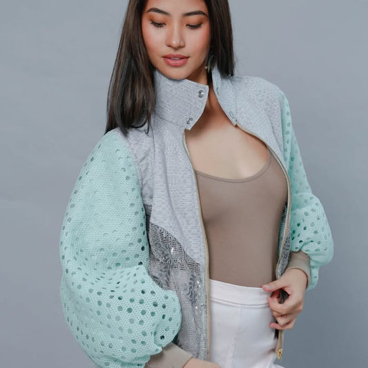 Bida Bida Bomber Jacket with Green Punch hole sleeves in Binakol Weave