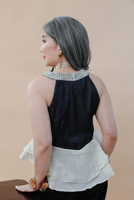 Denim Halter Top Jacket with Piña Callado Collar of Lumban
