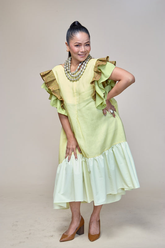 Masayahin Balloon Dress in Light Green and Light Yellow with Yellow Binakol