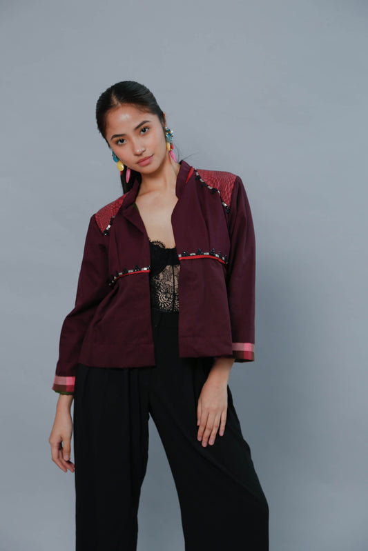 Burgundy Crop Kimono with Binakol Weave and Hand Embroidery