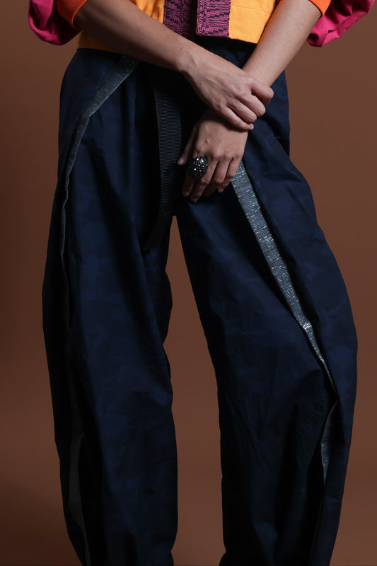 ADJUSTABLE WIDE BLUE FATIGUE MILITARY PANTS WITH SILVER METALLIC HABLON