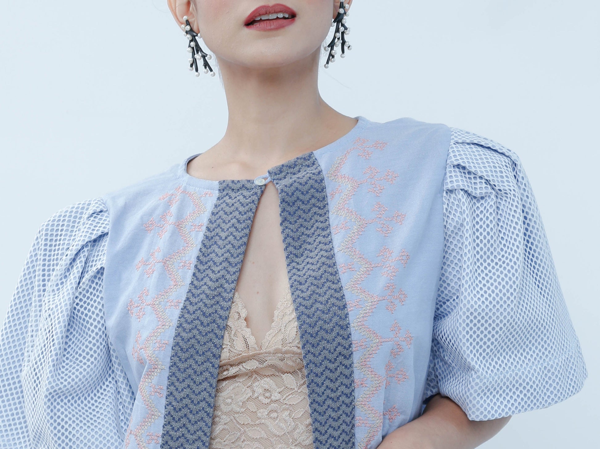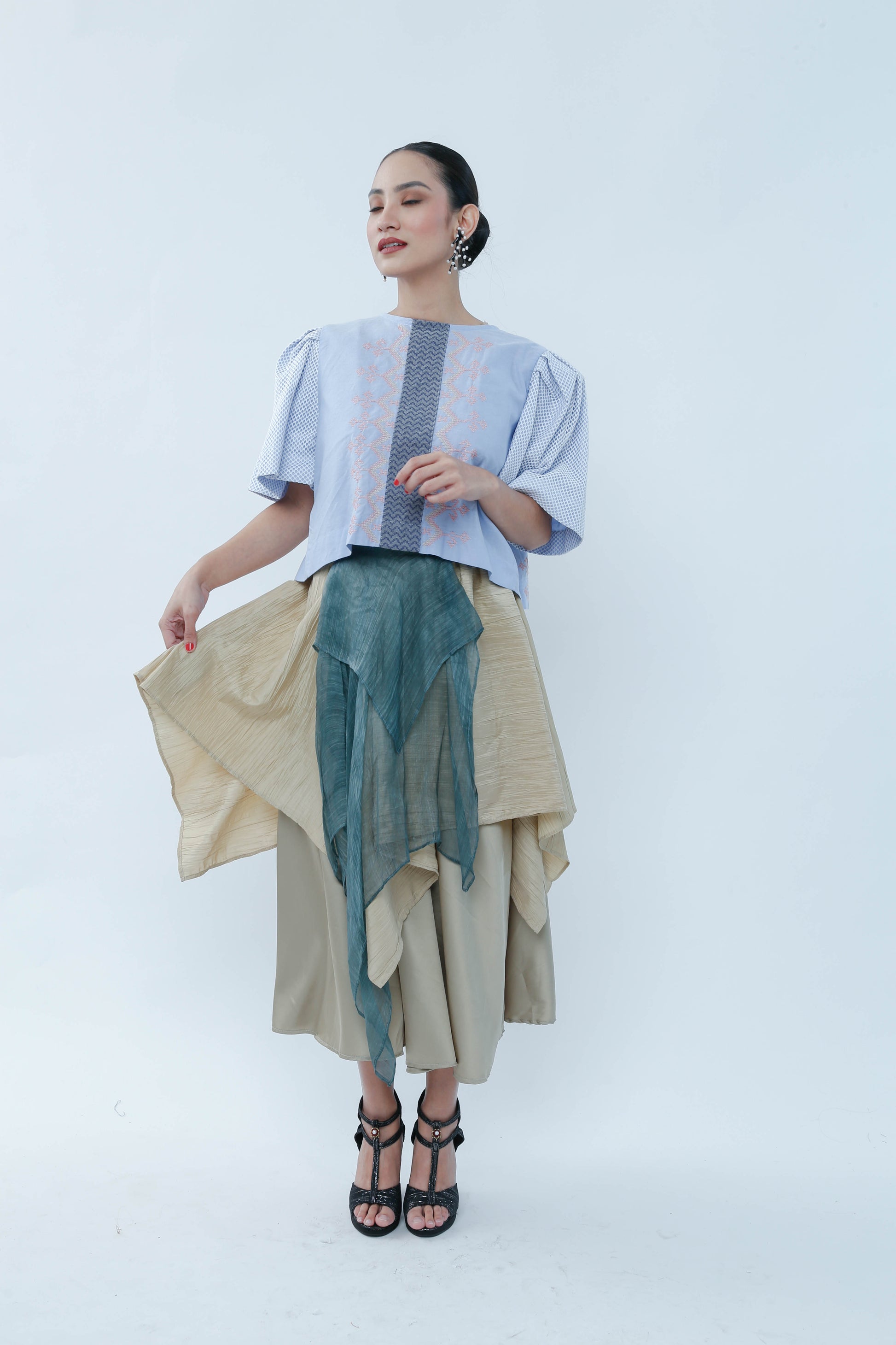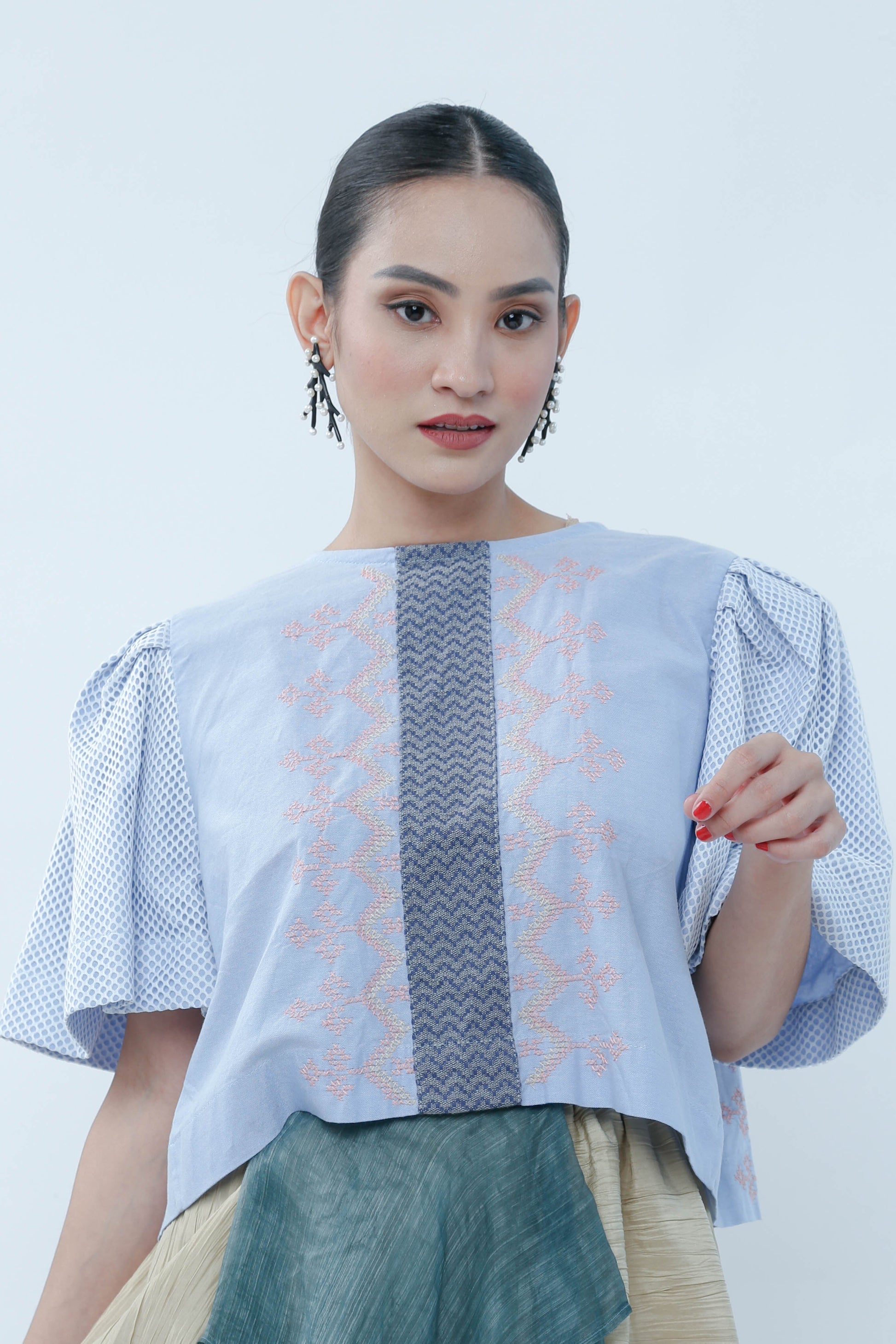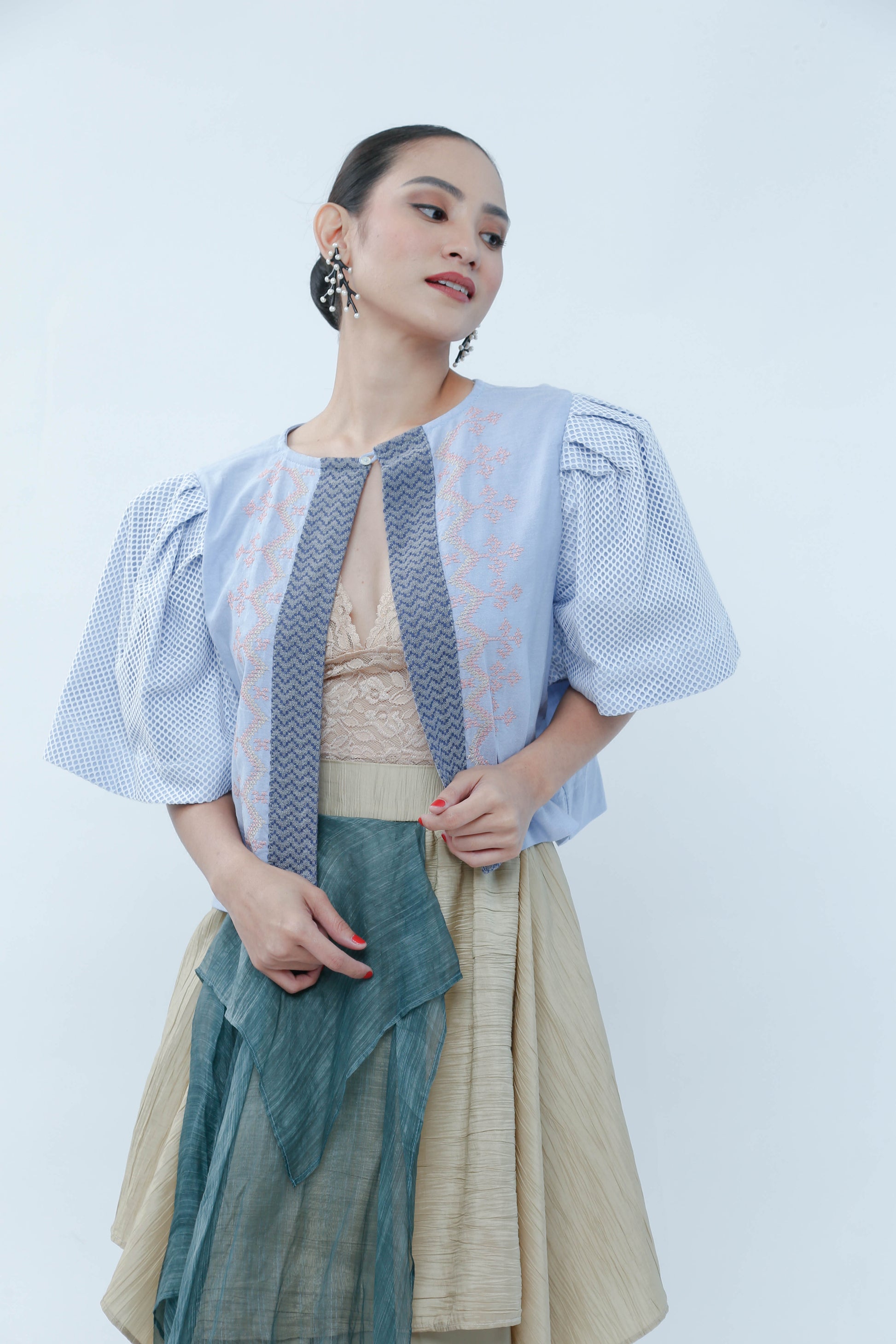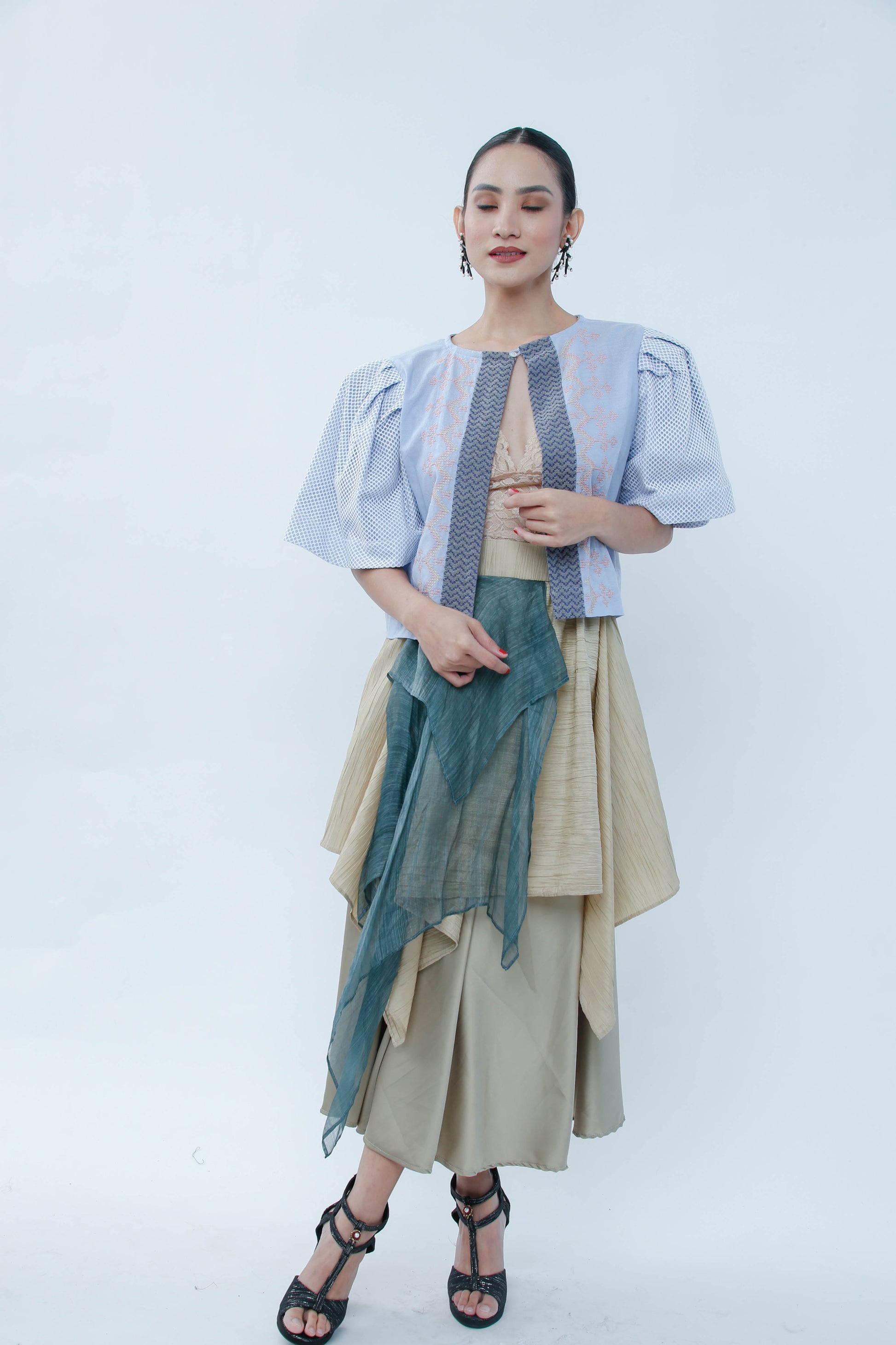 The Alon Top with Nesif Embroidery captures the playful spirit of the Tagalog word for “wave” with its lively pink and gray Tboli-inspired embroidery. This top adds a fun, colorful twist to your look while celebrating Filipino artistry, making it perfect for those who love to stand out with vibrant cultural flair.