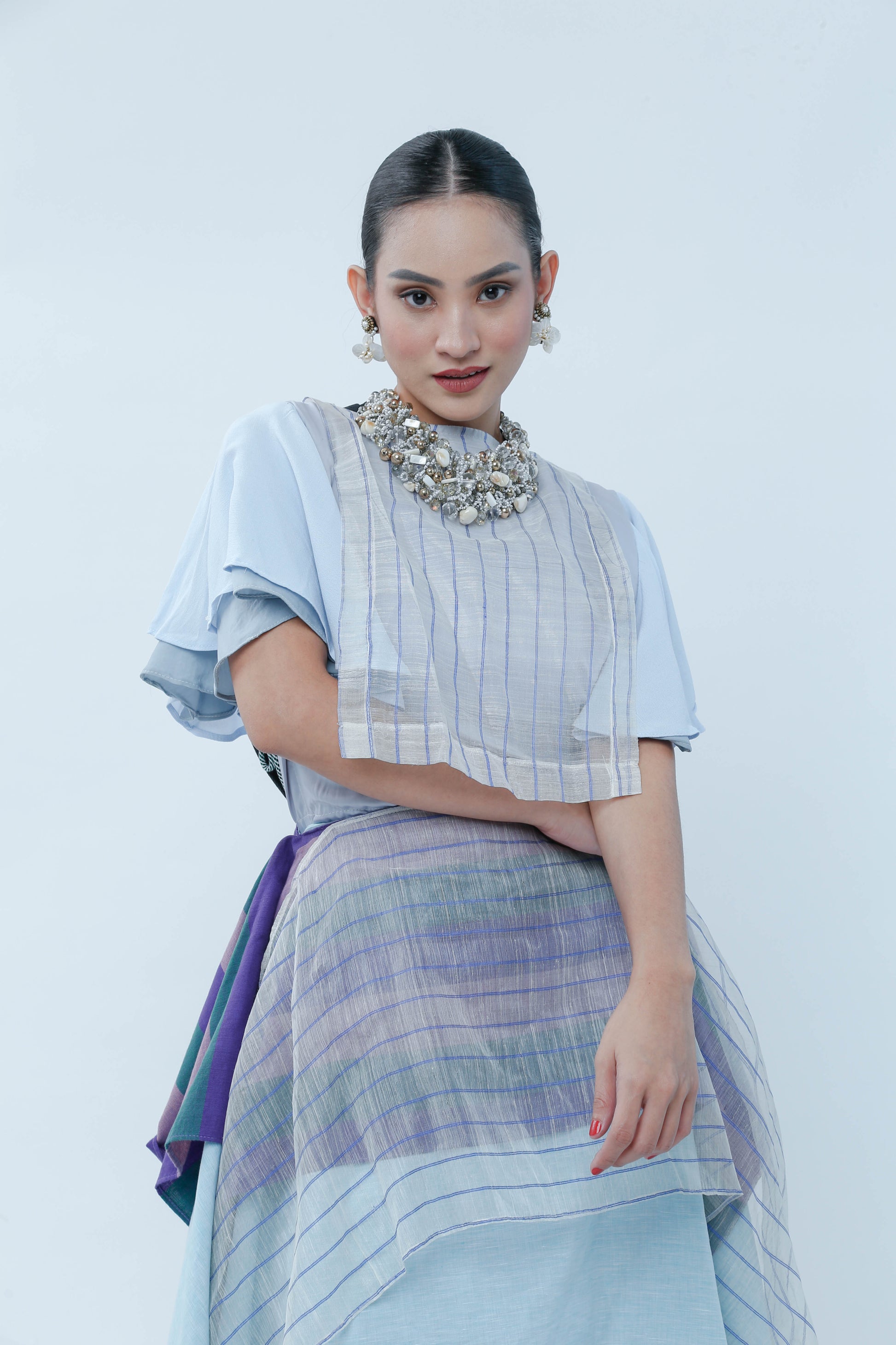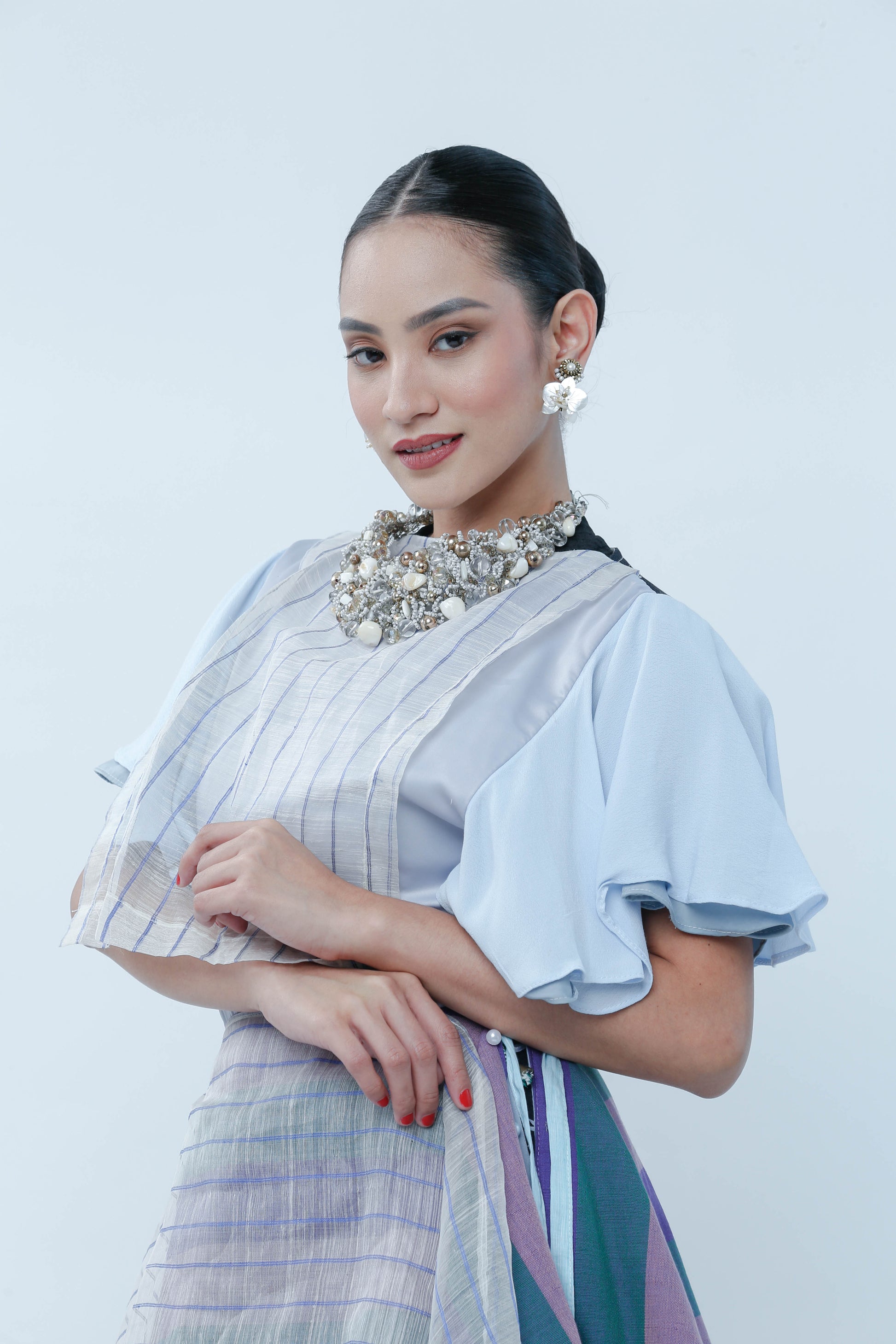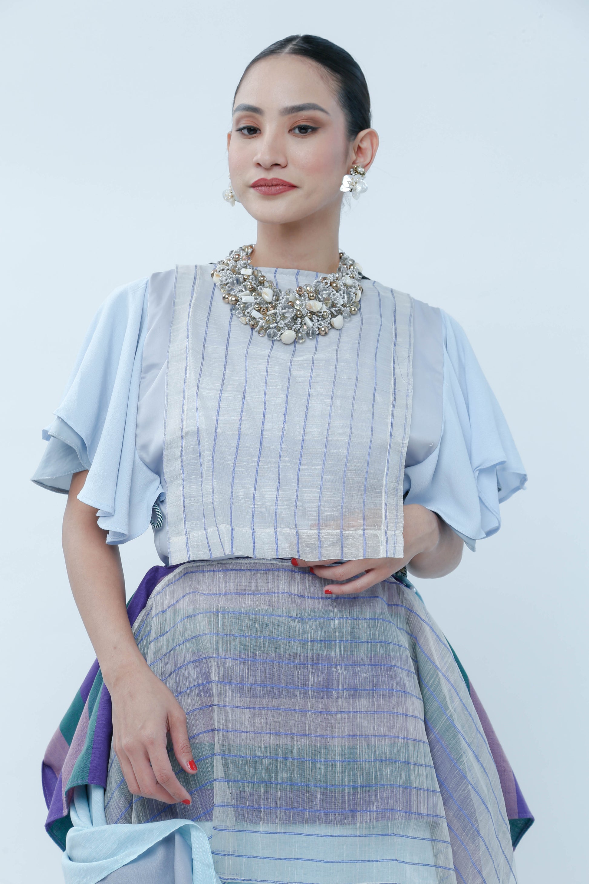 Elevate your event attire with the Bib With Piña Stripe, crafted from exquisite blue striped Piña fabric. This piece offers a fresh and youthful appeal while maintaining a refined sophistication, making it an ideal choice for stylish gatherings. Its lightweight texture ensures comfort, while the classic stripes add a timeless charm to your ensemble.