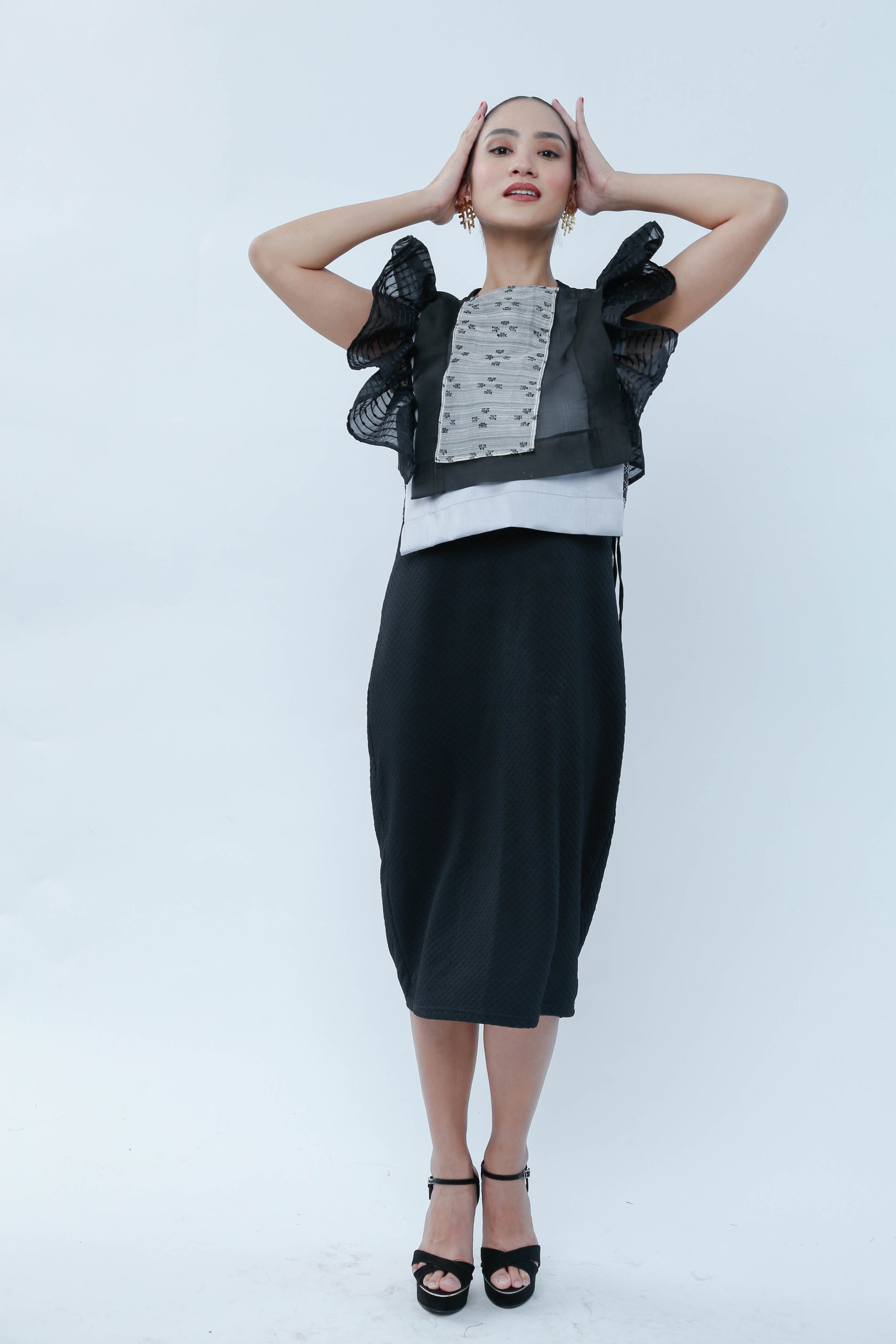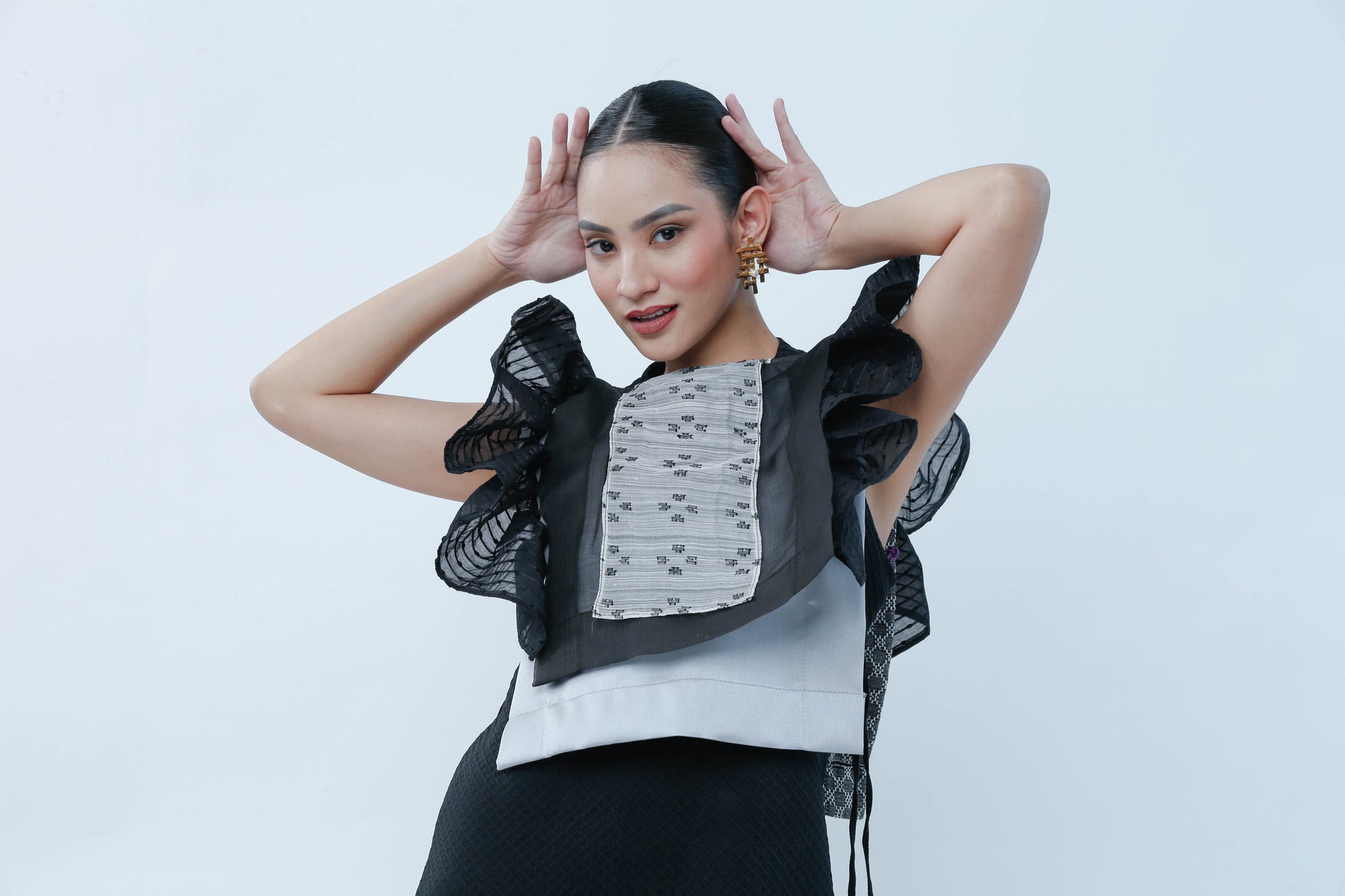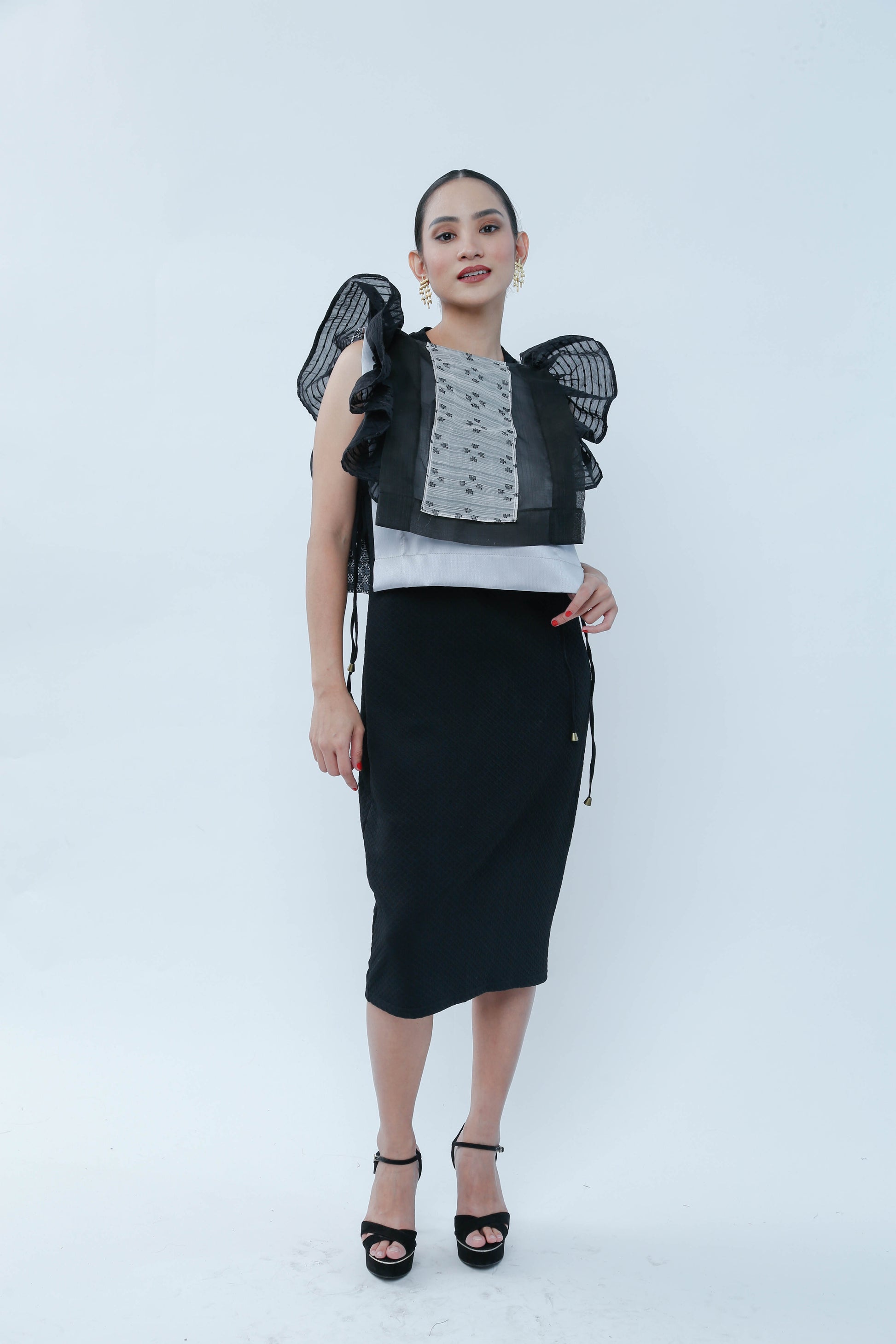 Bongga ka day! Black for sophistication but ruffles for demure charm! This Black Bib in Bonggang Ruffles effortlessly blends bold elegance with a playful touch, making any outfit pop with personality. Perfect for those who want to stand out while keeping it chic and fun.