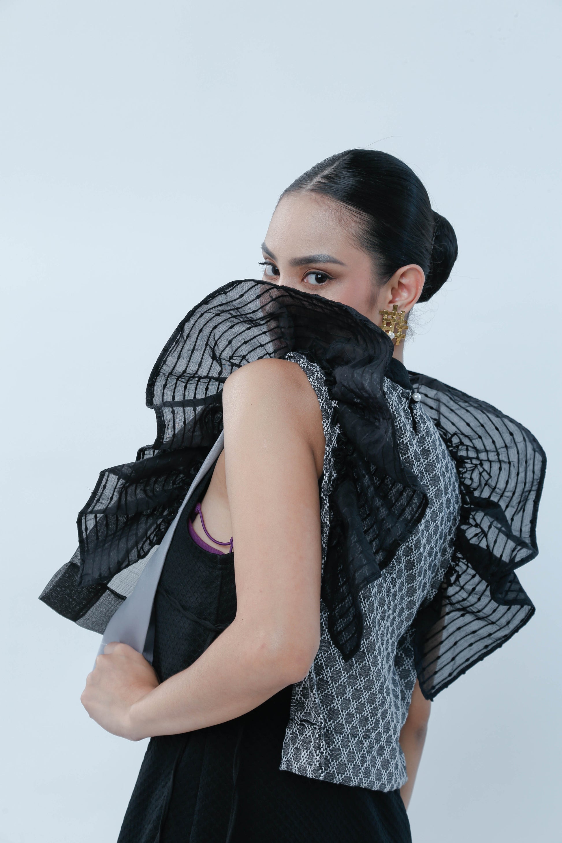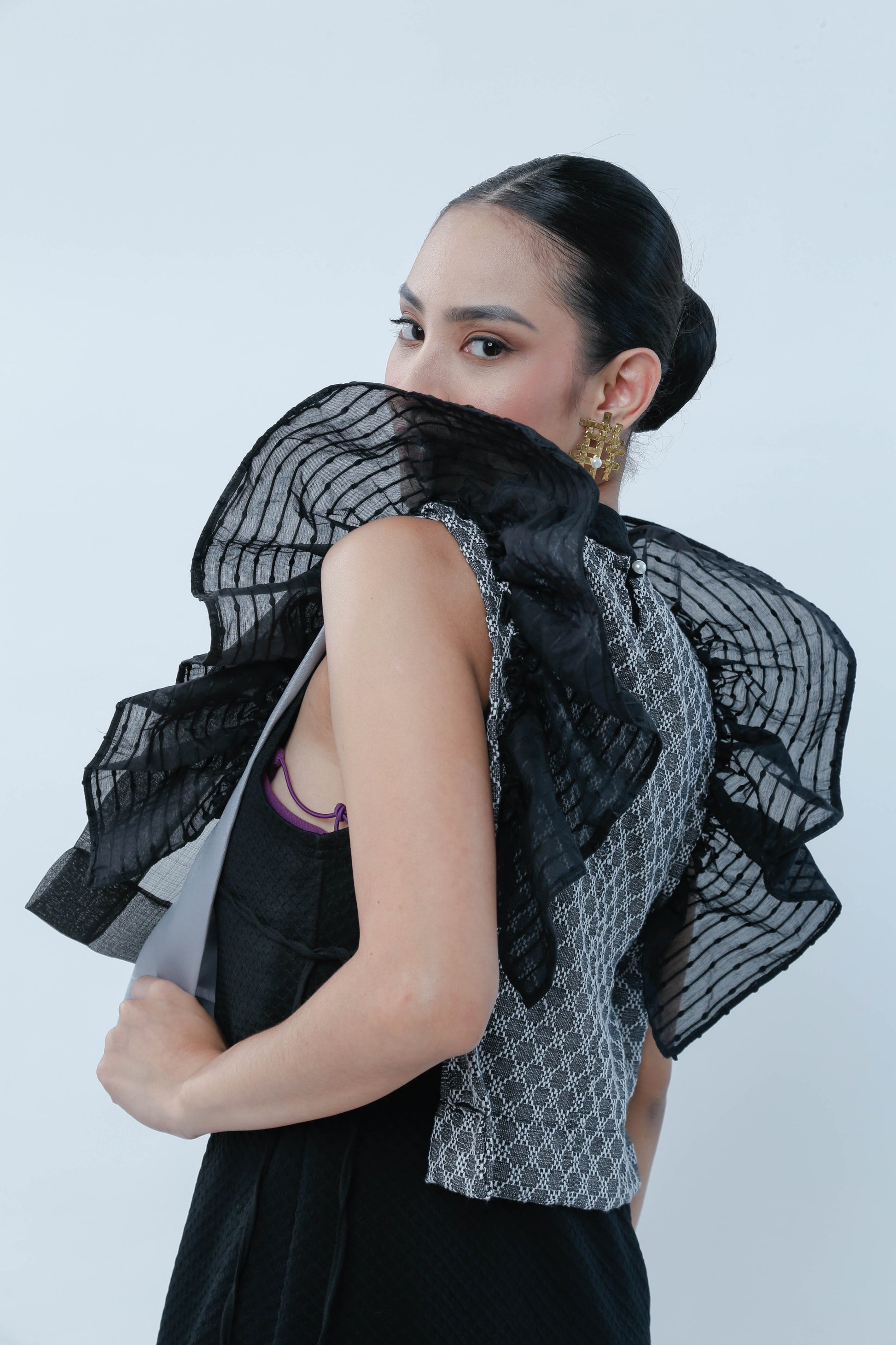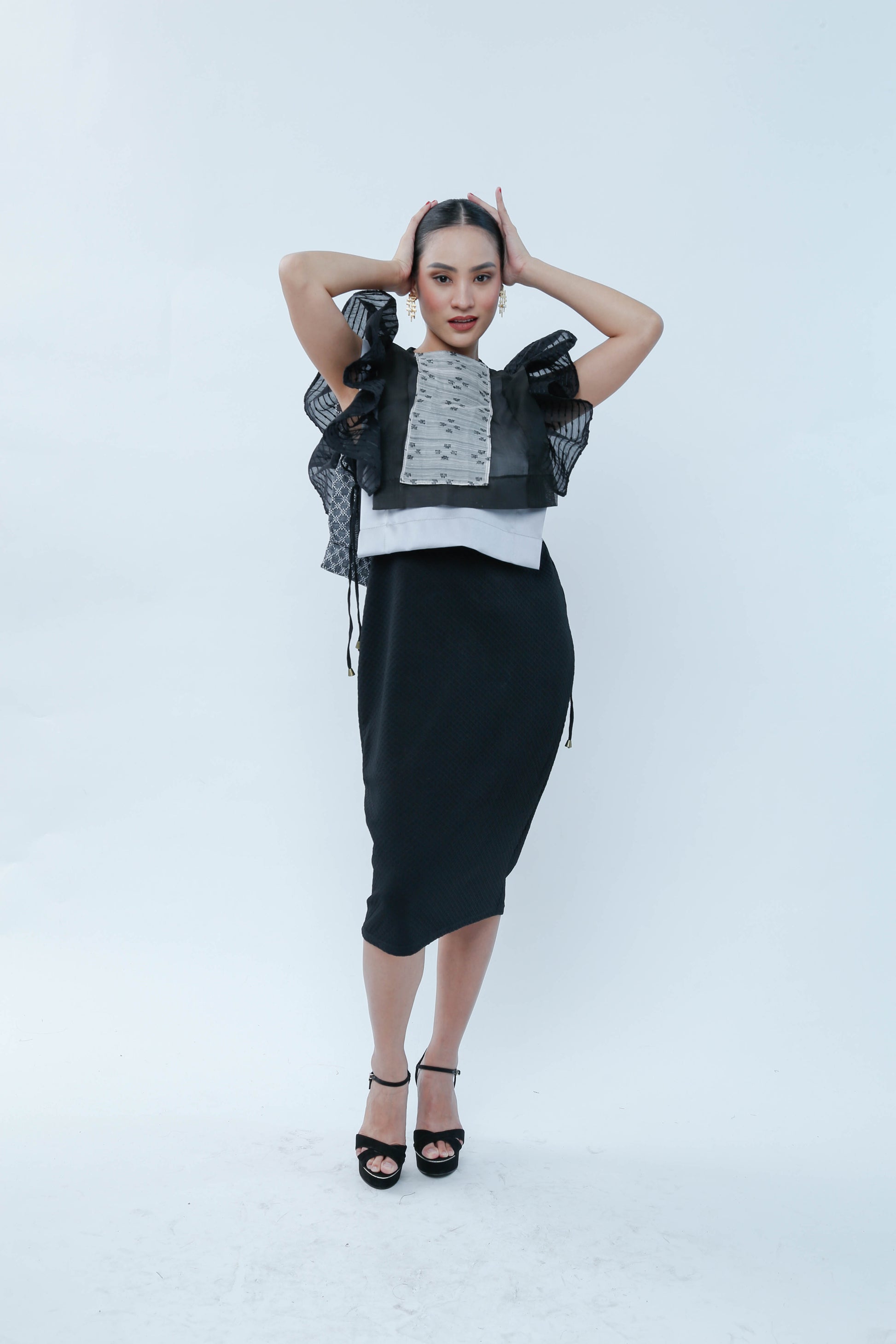 Bongga ka day! Black for sophistication but ruffles for demure charm! This Black Bib in Bonggang Ruffles effortlessly blends bold elegance with a playful touch, making any outfit pop with personality. Perfect for those who want to stand out while keeping it chic and fun.