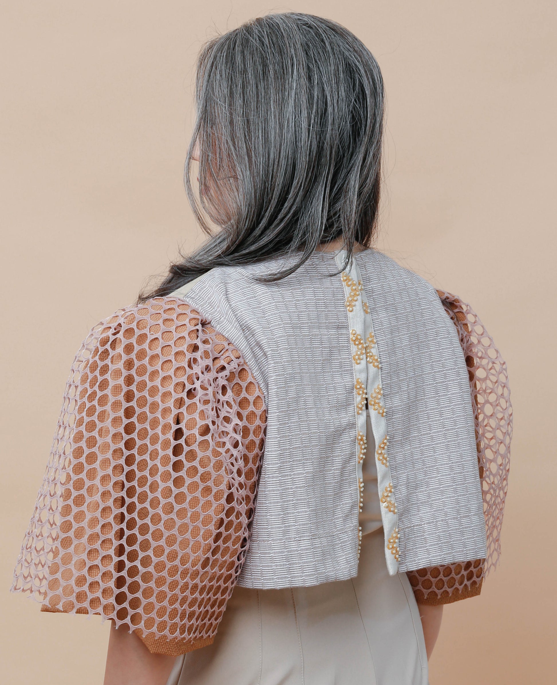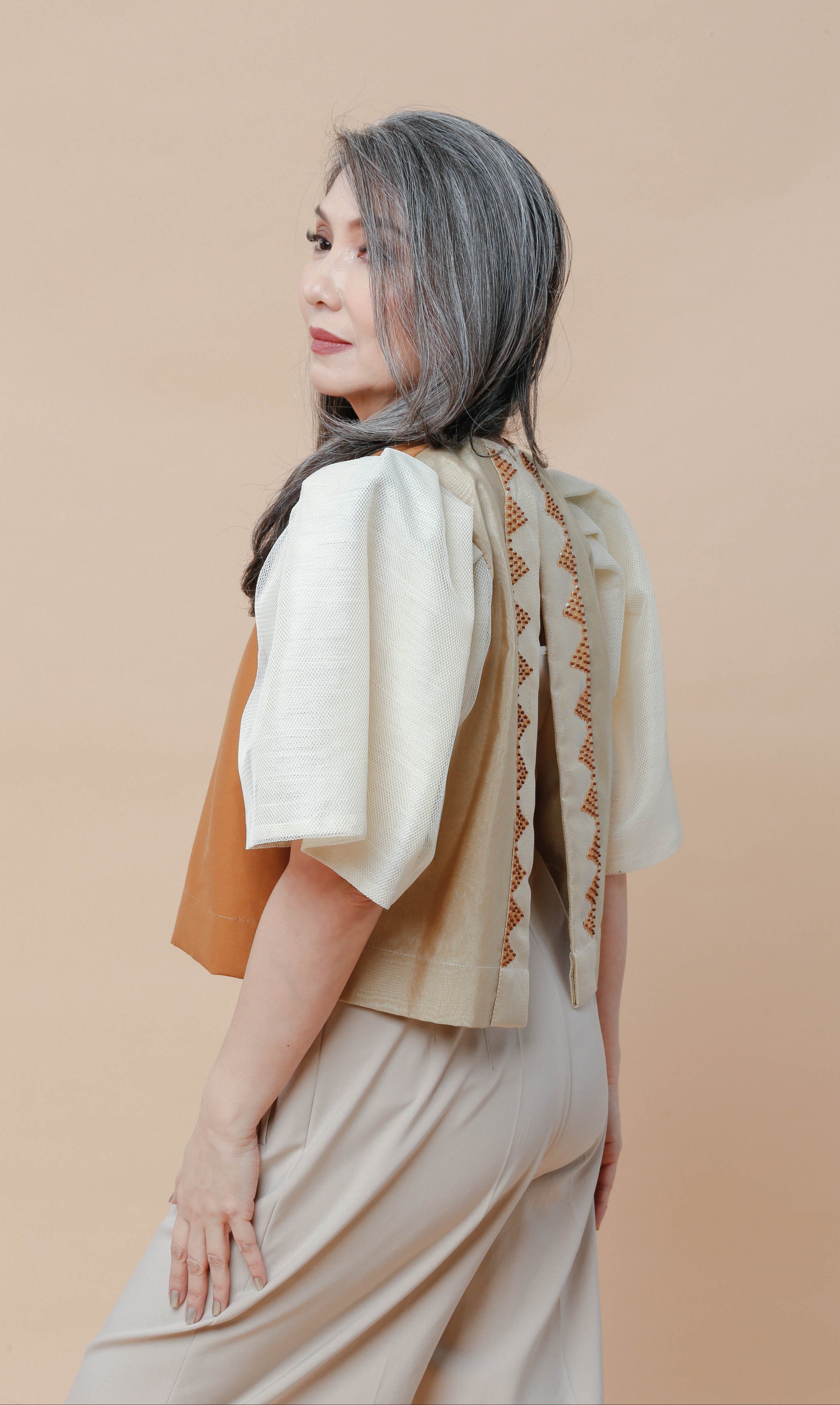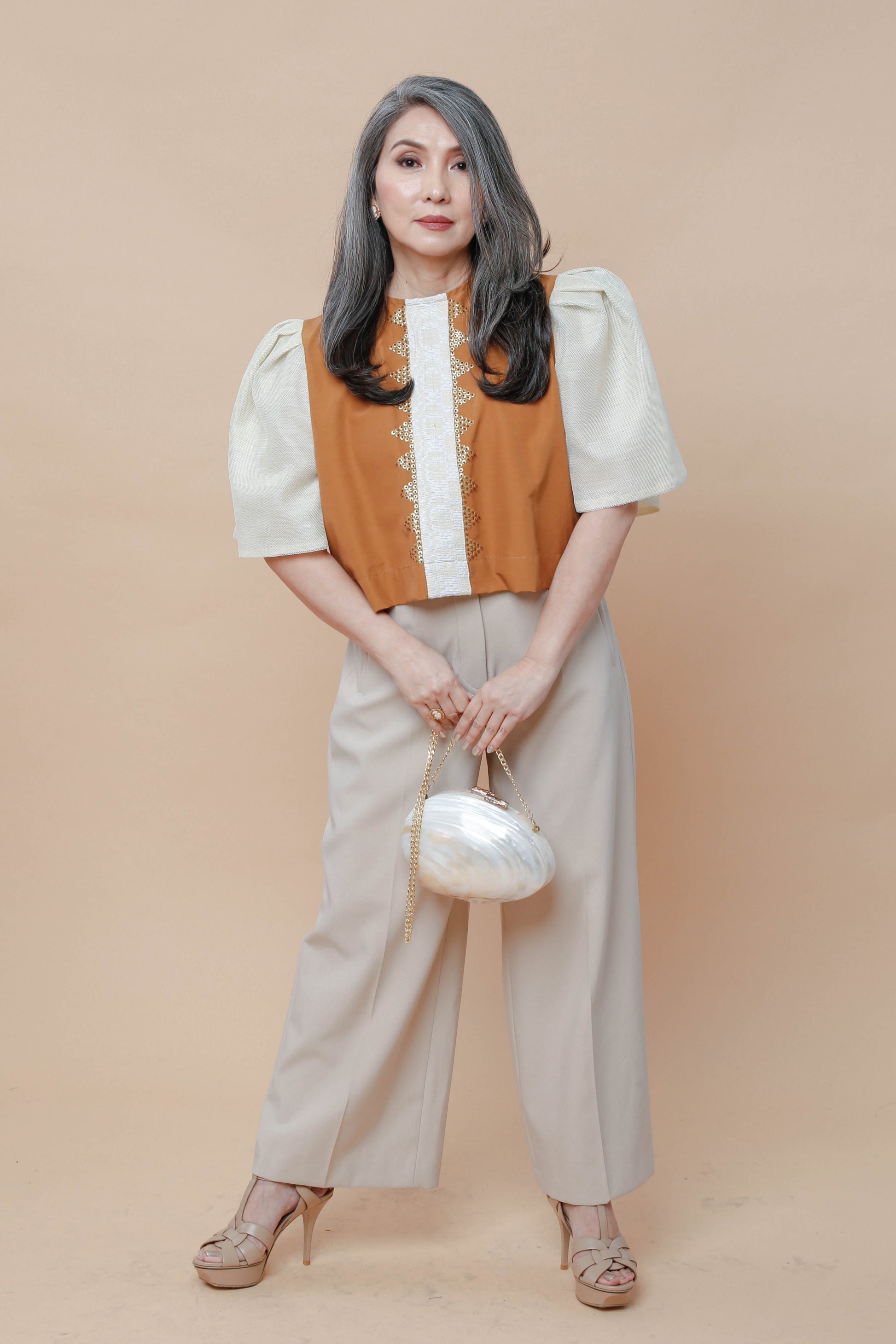 This elegant blusa in a rich burnt orange hue is beautifully enhanced with handcrafted beadworks from Pandi, Bulacan. The intricate detailing adds a touch of refined artistry, making it perfect for sophisticated occasions. Its warm color complements various styles, offering both tradition and charm in one exquisite piece.