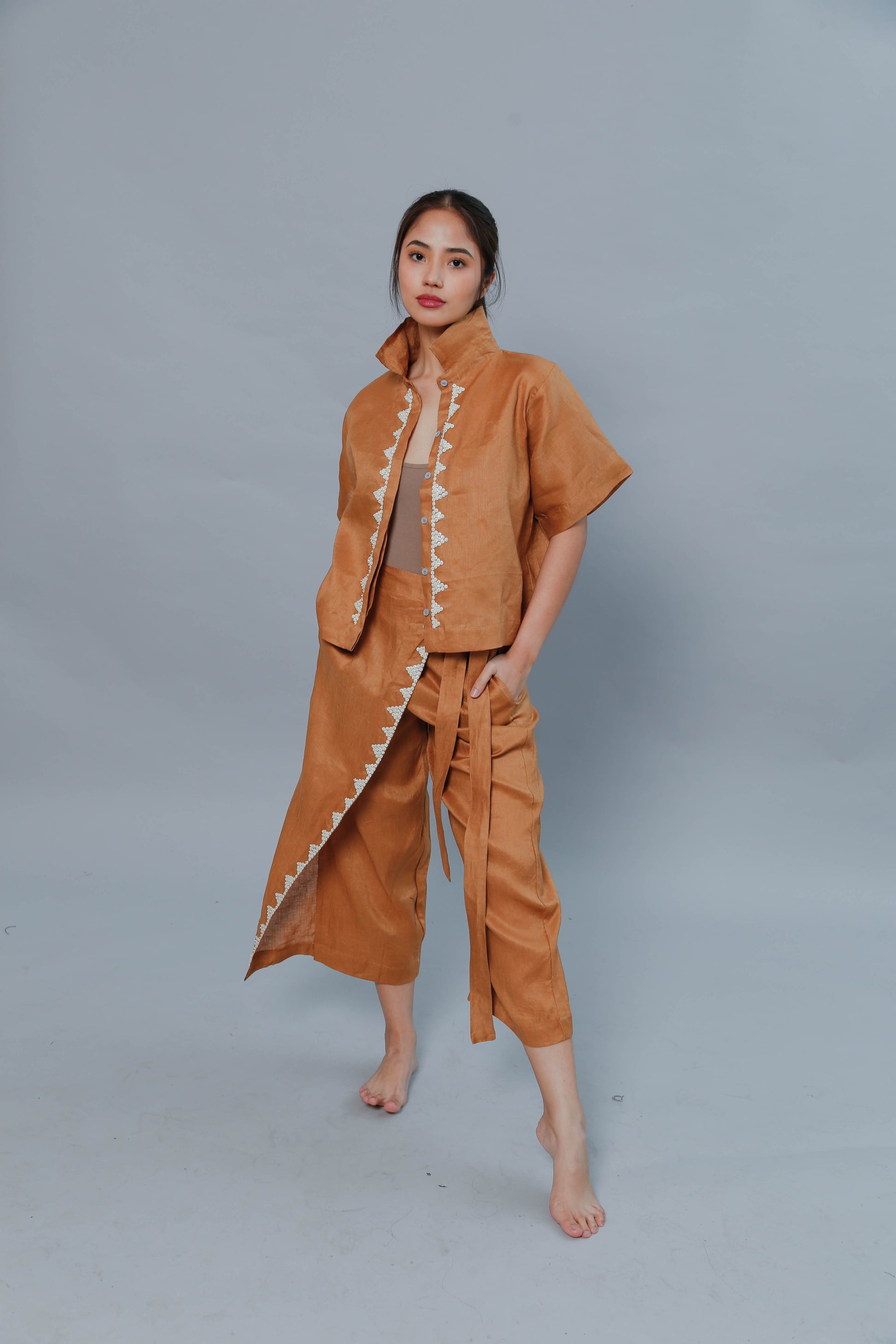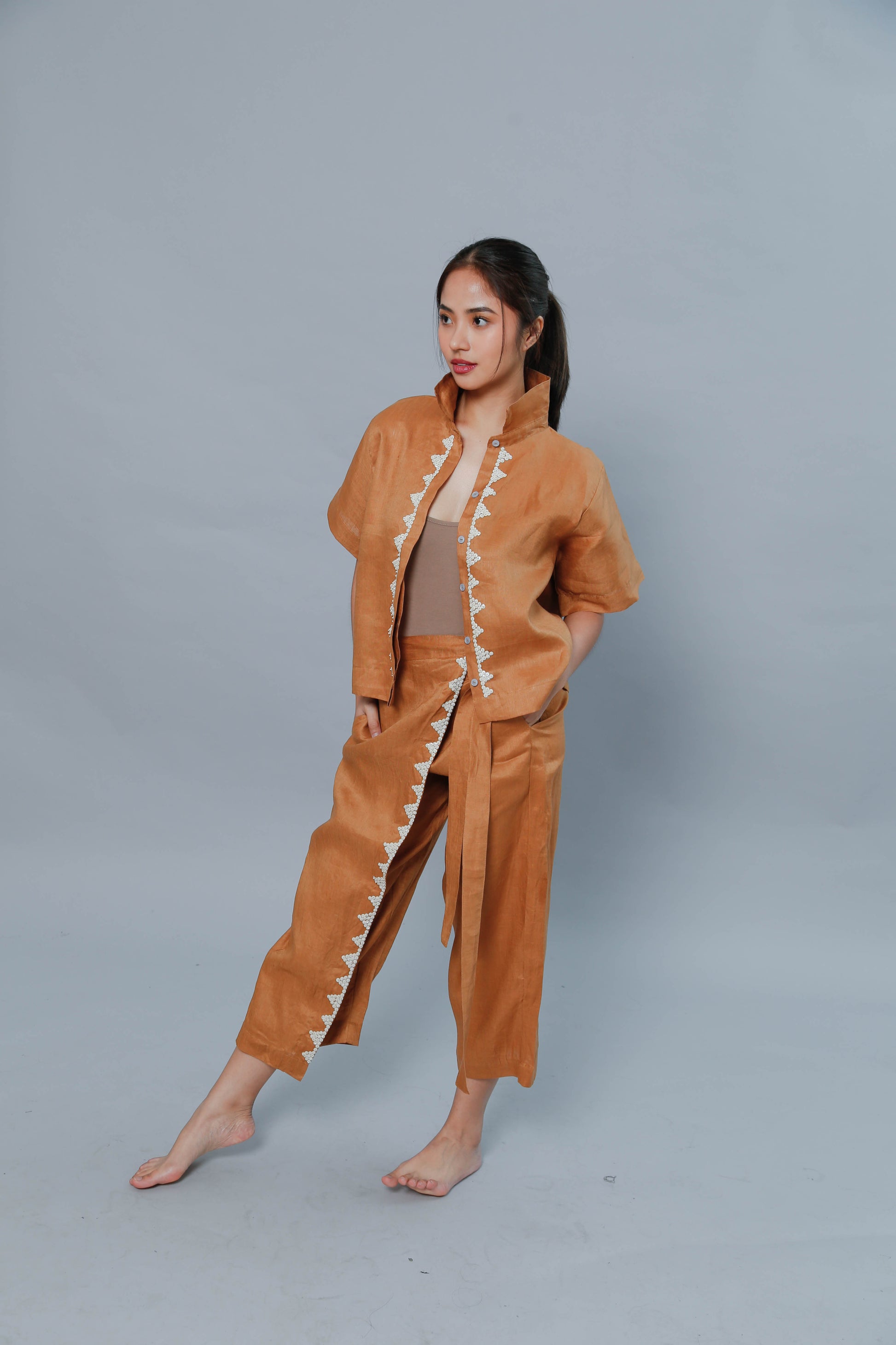 Imagine yourself strolling along a sun-drenched beach in our Lakwatsa Linen Brown Coords. This exquisite set features our best-selling pants and a matching top, both lovingly hand-embroidered with intricate beadwork by the Tboli Tribe of South Cotabato. The comfortable garterized back and adjustable ribbon ensure a flattering fit. Experience the beauty of handcrafted Filipino fashion.