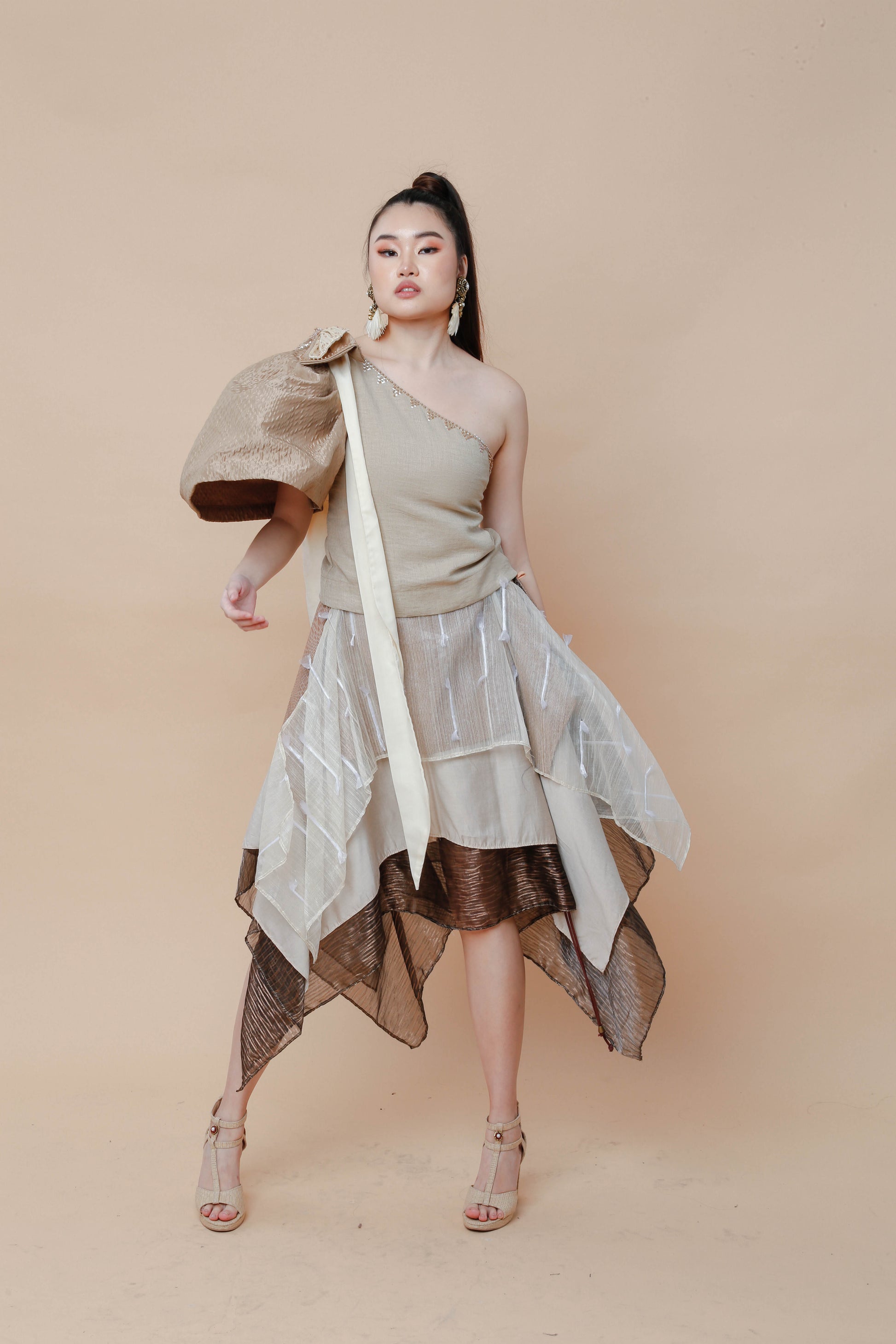 Elevate your formal wardrobe with this versatile freestyle skirt crafted from exquisite piña fabric. Featuring soothing earth tones and inspired by the classic candy wrapper barong design, it offers multiple ways to style, ensuring a unique and refined look for any occasion. Its natural texture and elegant drape provide both comfort and sophistication, making it a timeless piece that seamlessly blends tradition with modern fashion.