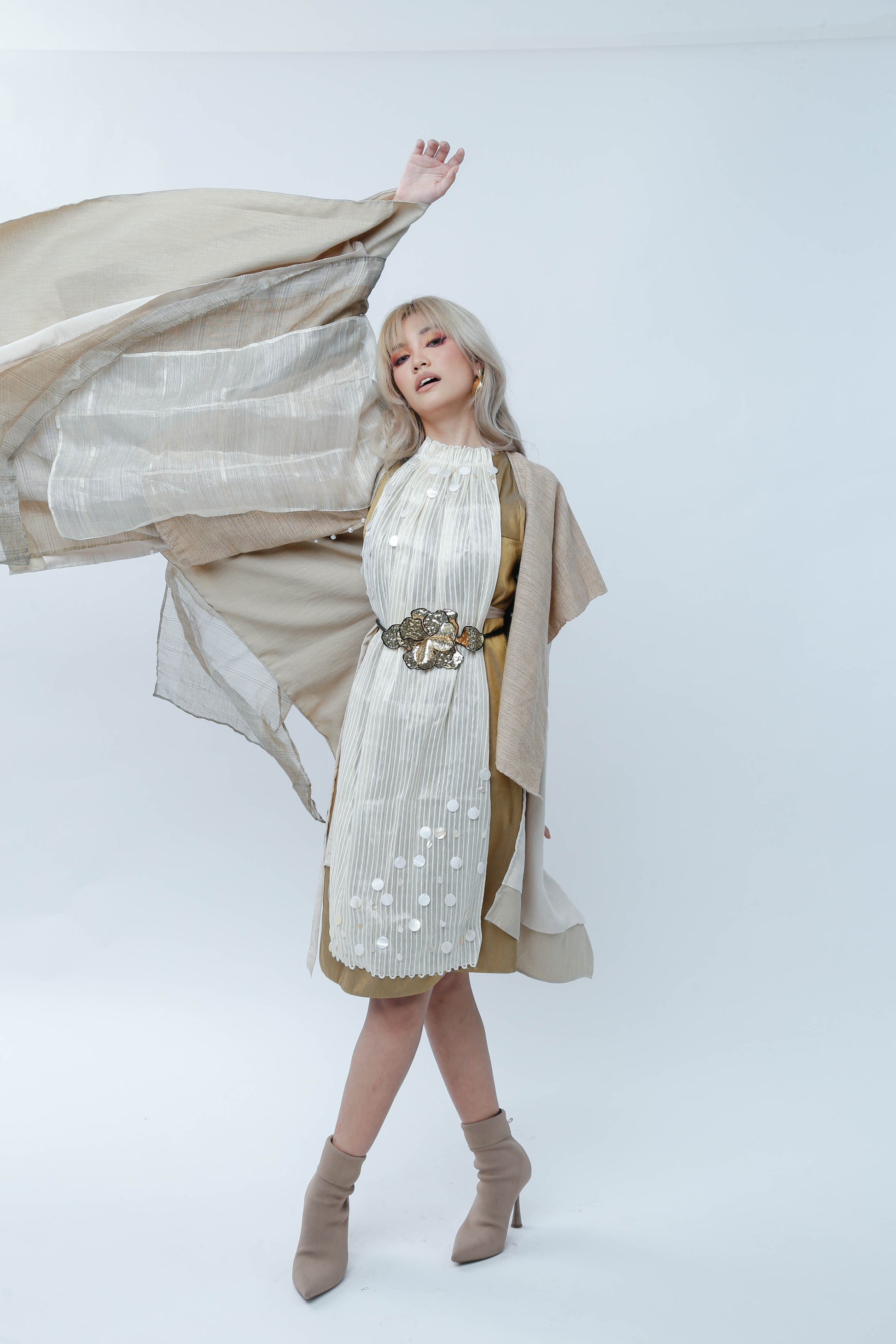 Dress: Shantung with Rare Abaca lined with Yarn, with details of Cebu Shells, hand embroidered by our beadwork artisans in Pandi