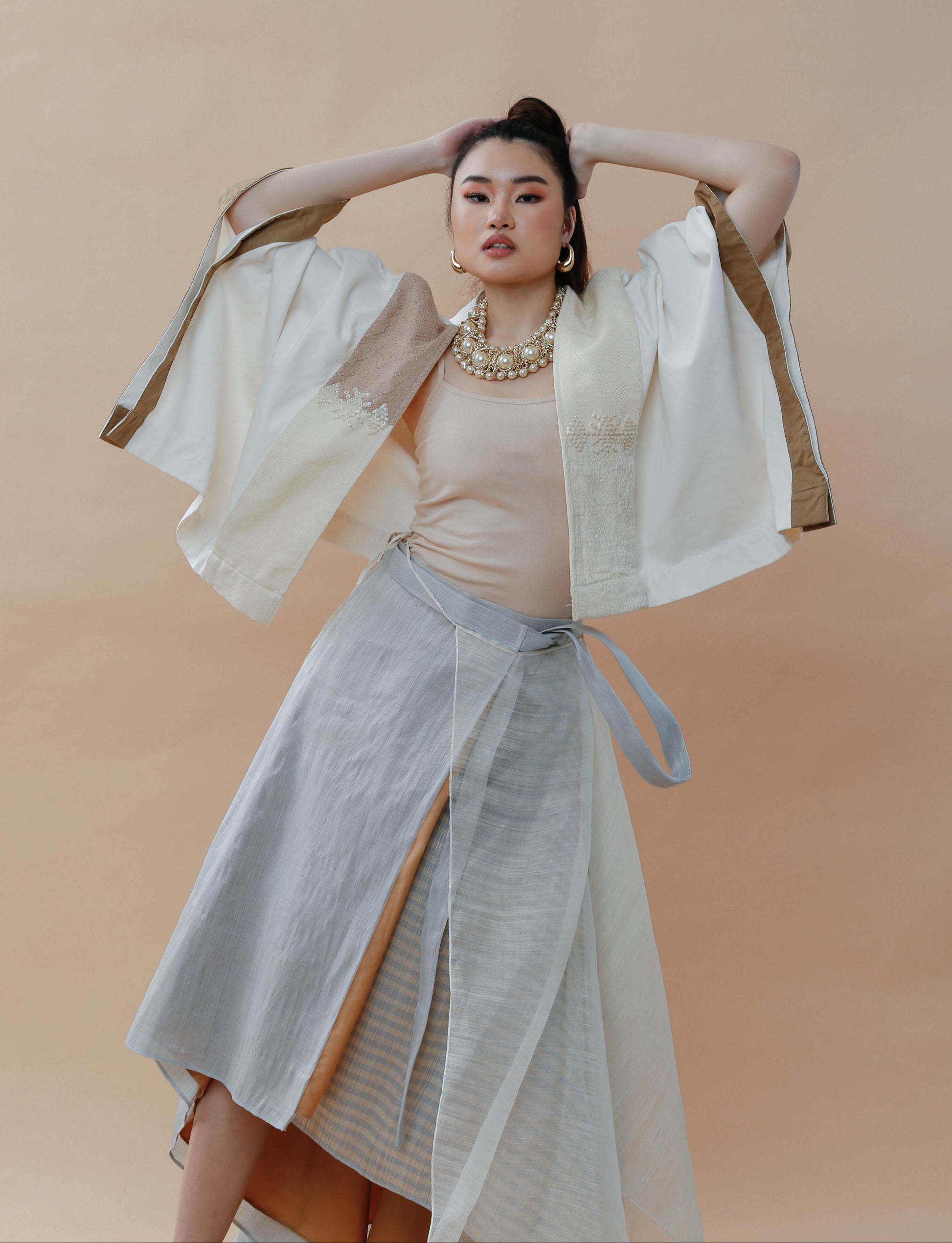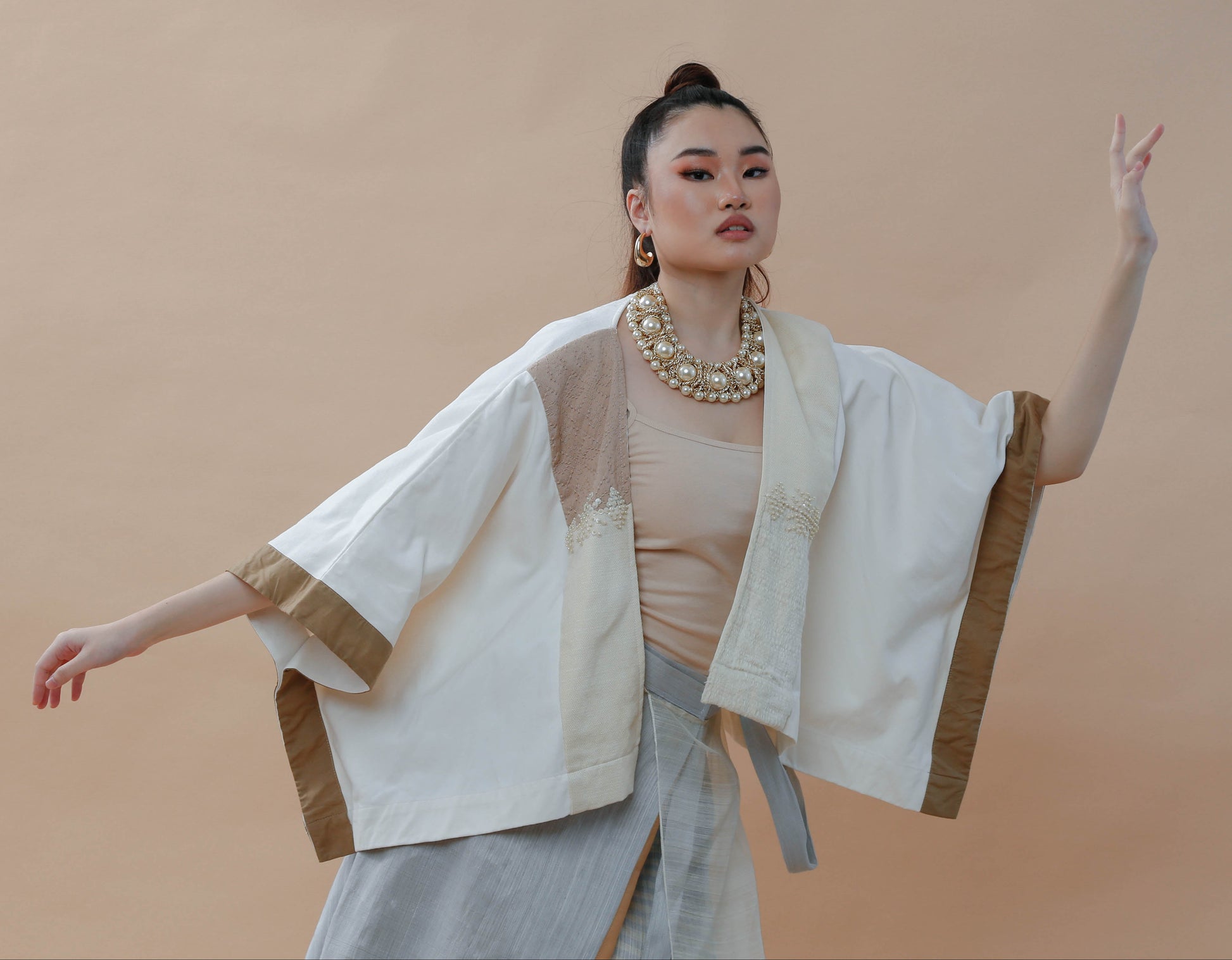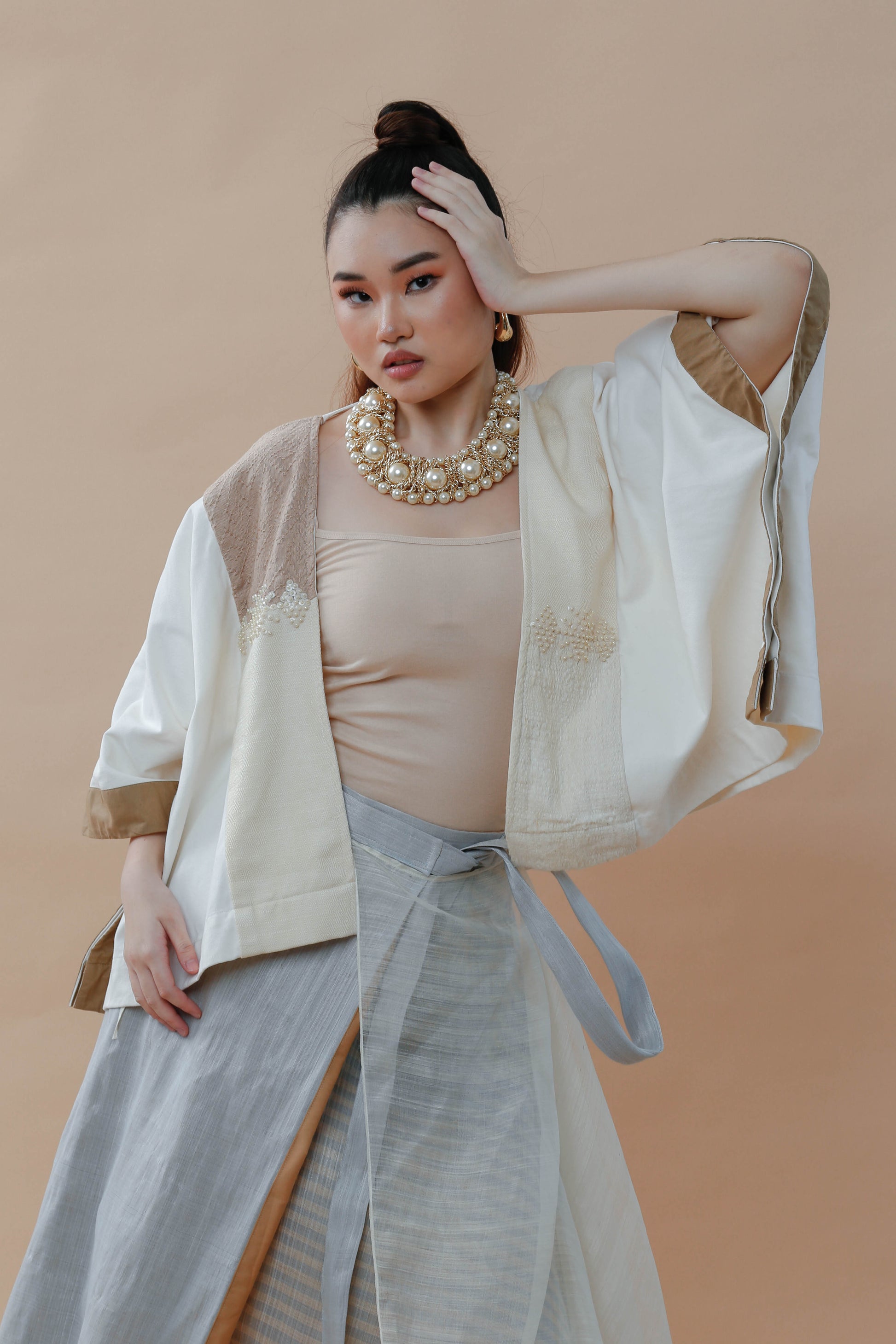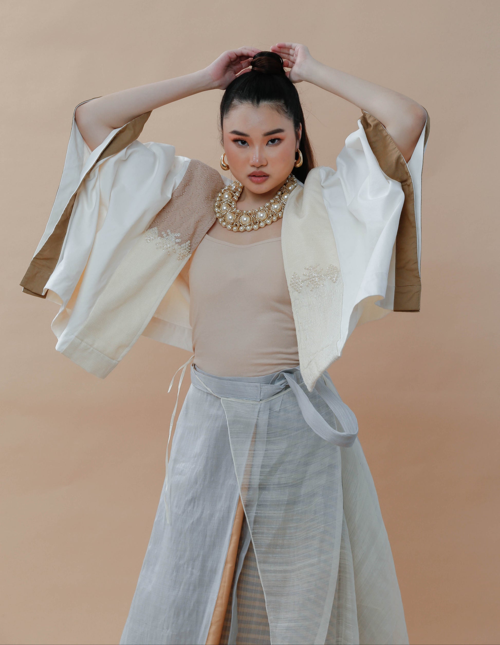 Experience the rich cultural heritage of the Philippines with this Heritage Poncho in cream, meticulously crafted by combining traditional Luzon and Visayan weaving techniques with the distinct patterns of Kalinga and Negros weaves. This piece exemplifies expert craftsmanship, showcasing intricate textures and authentic regional artistry, making it a sophisticated statement of Filipino identity and heritage.