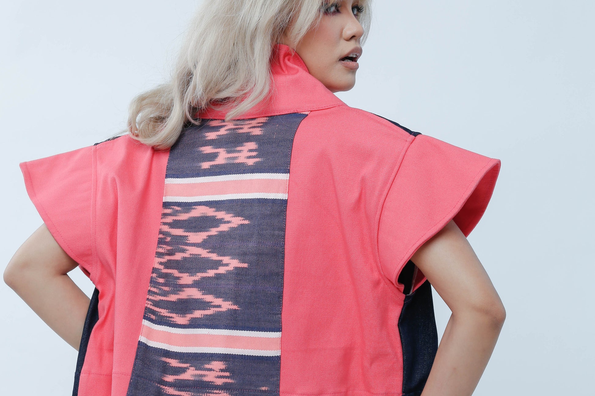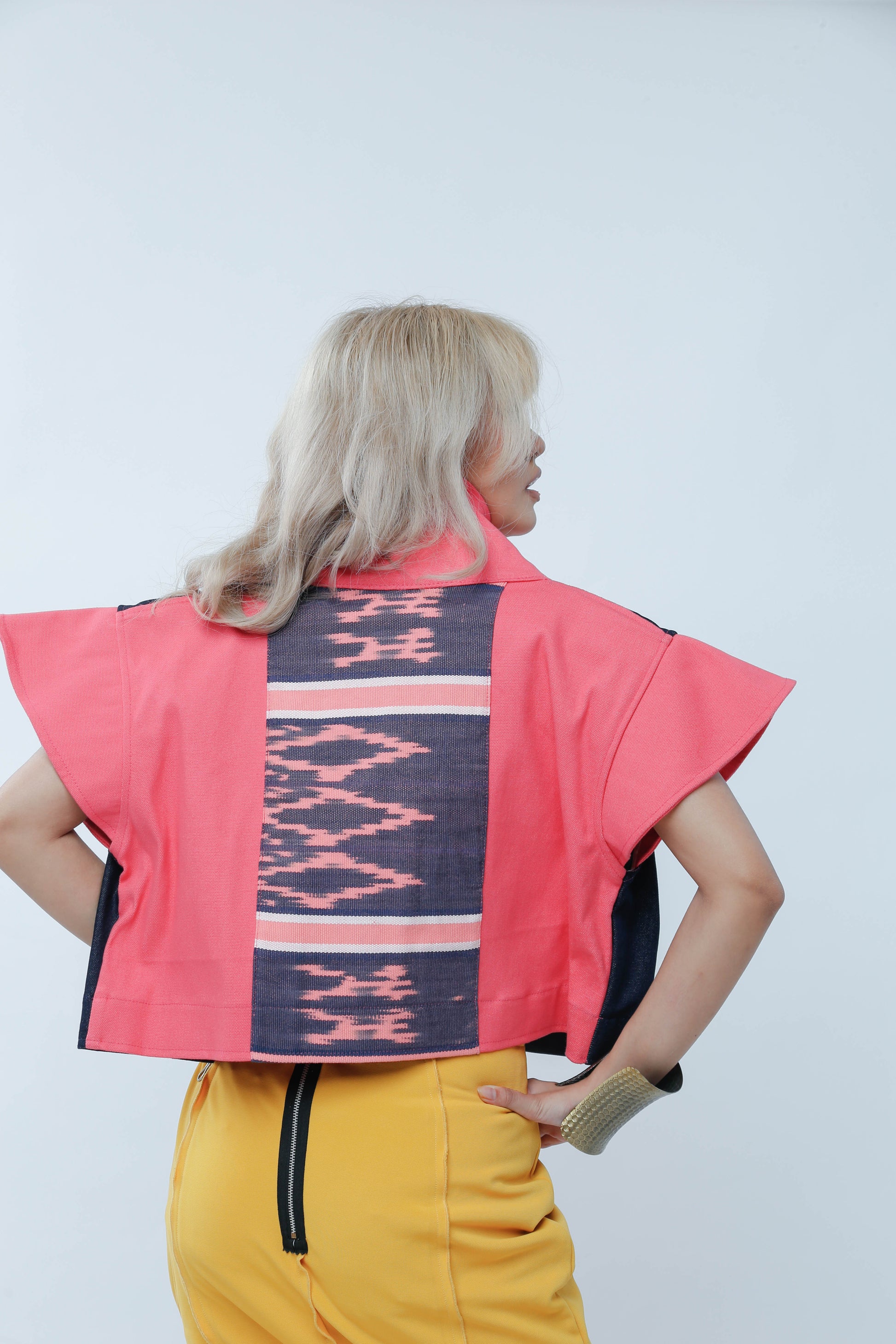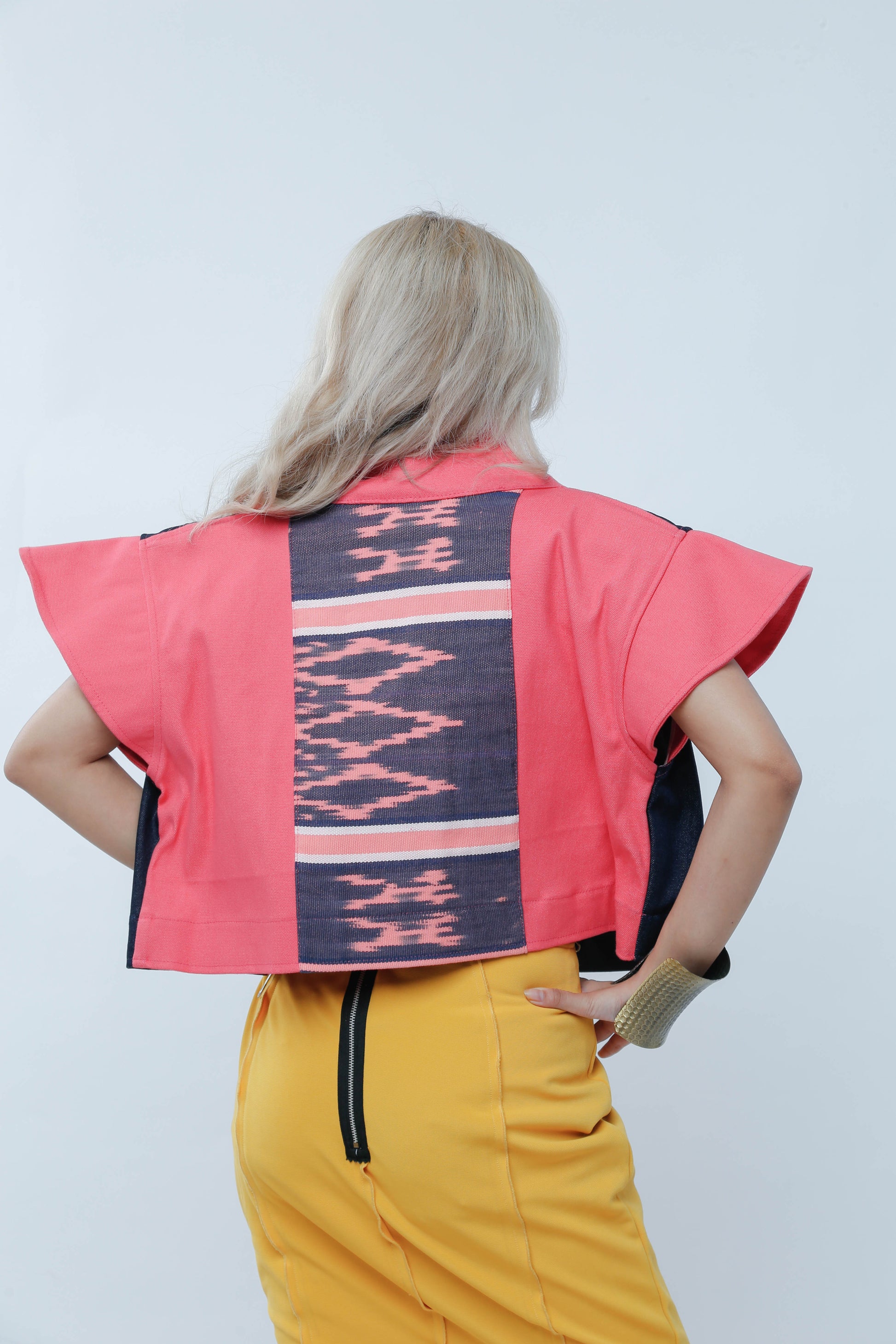 Add a splash of fun to your wardrobe with "I Got Your Front." This playful piece features a salmon denim front that pops, complemented by lively sleeves and a unique Ikat-patterned back. Perfect for those who love mixing bold textures and colors with a twist of personality.