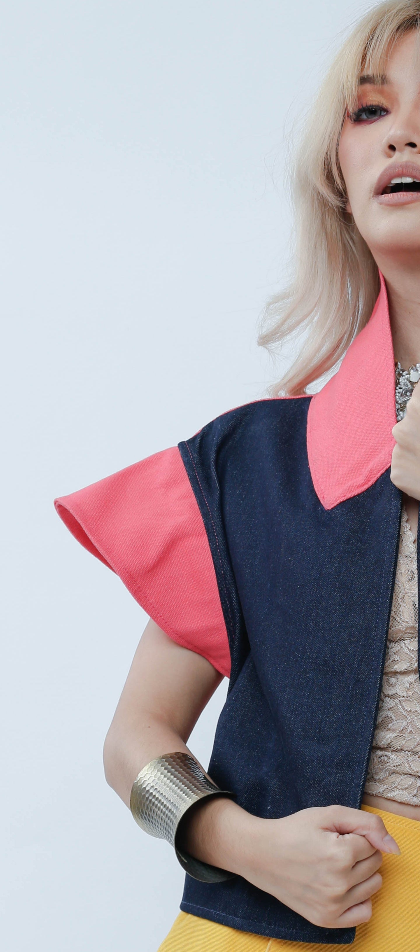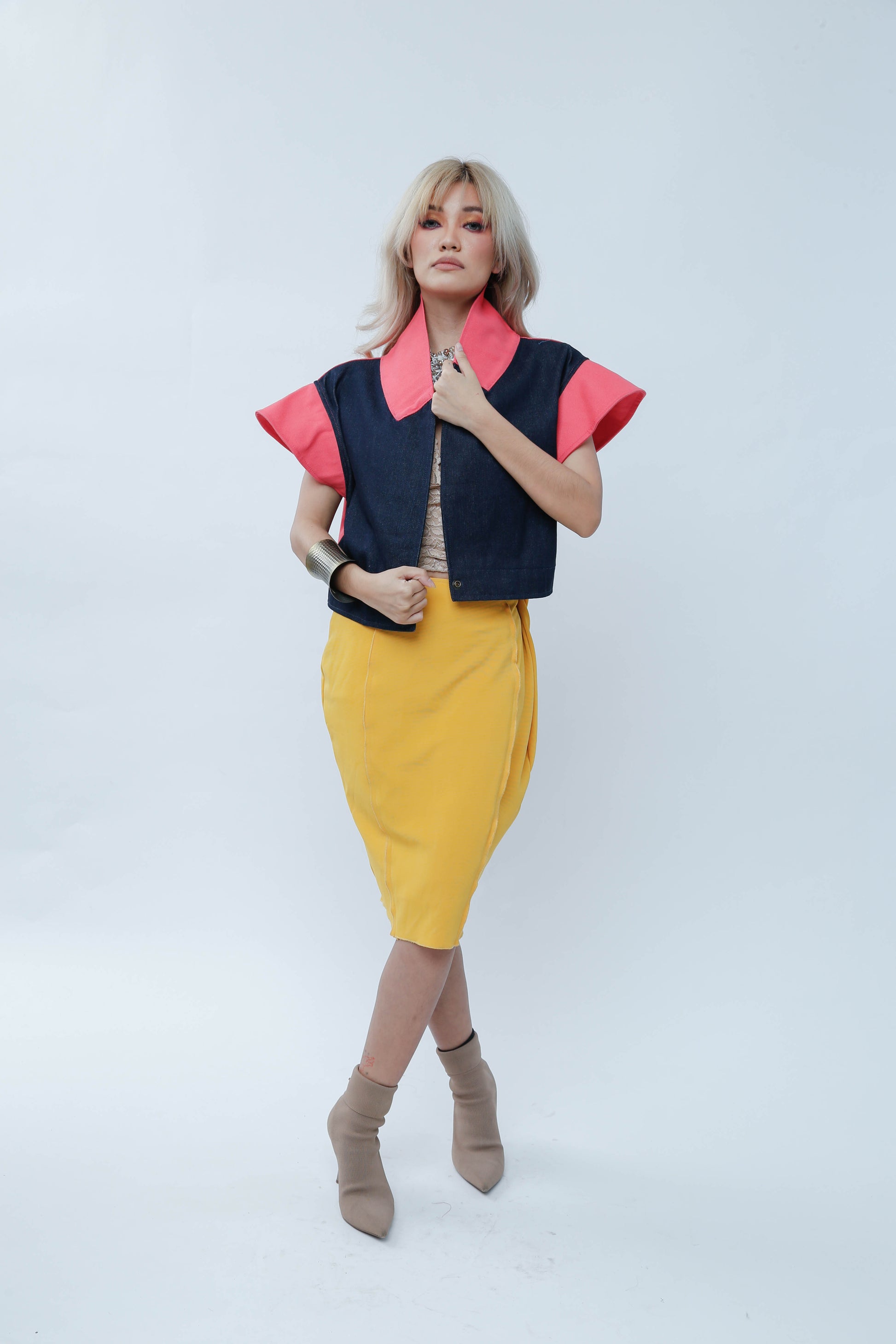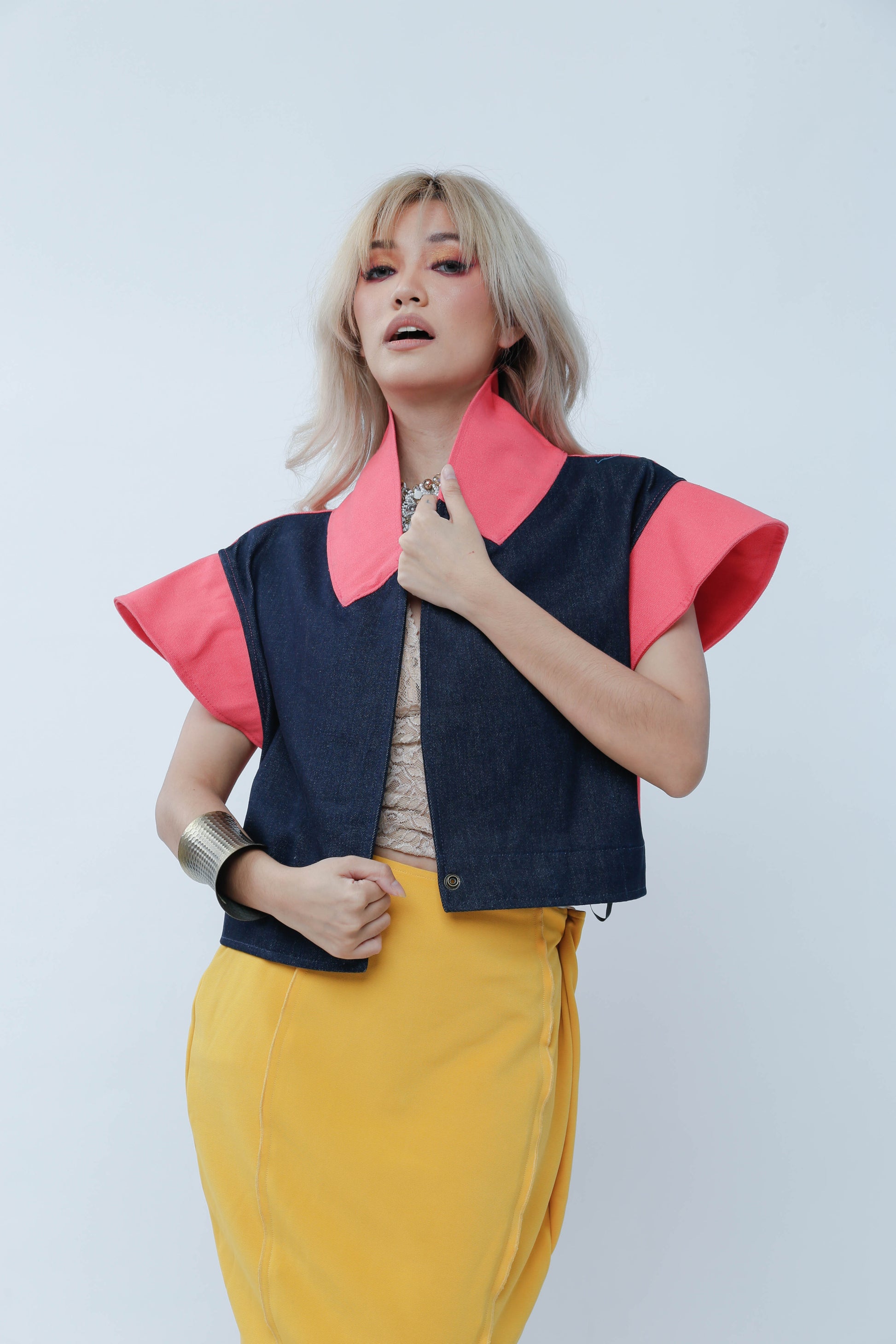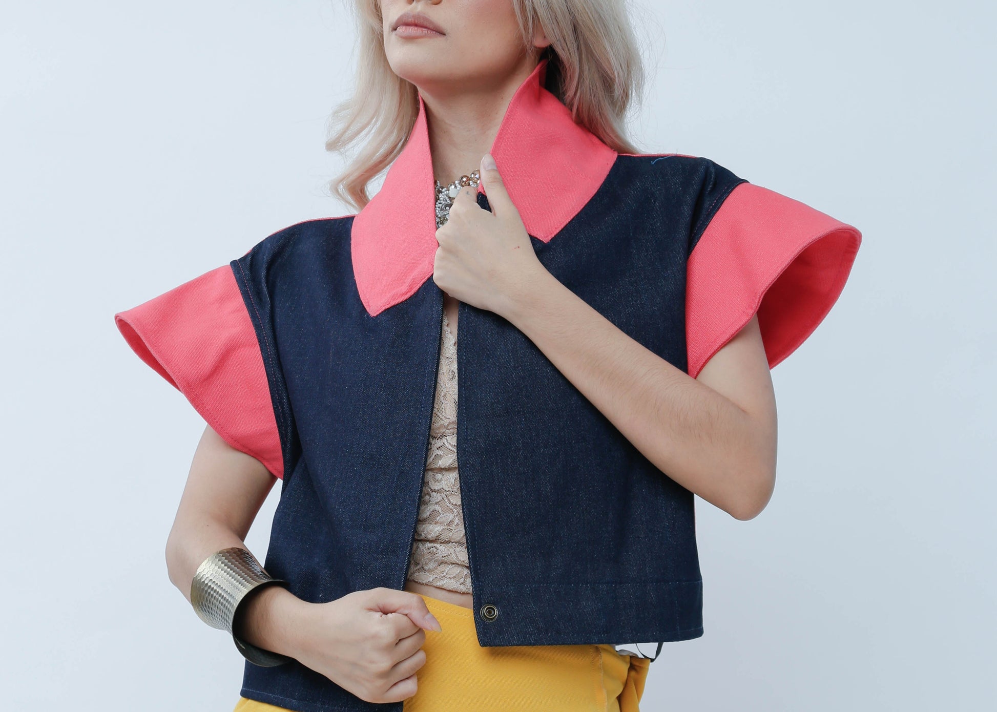 Add a splash of fun to your wardrobe with "I Got Your Front." This playful piece features a salmon denim front that pops, complemented by lively sleeves and a unique Ikat-patterned back. Perfect for those who love mixing bold textures and colors with a twist of personality.