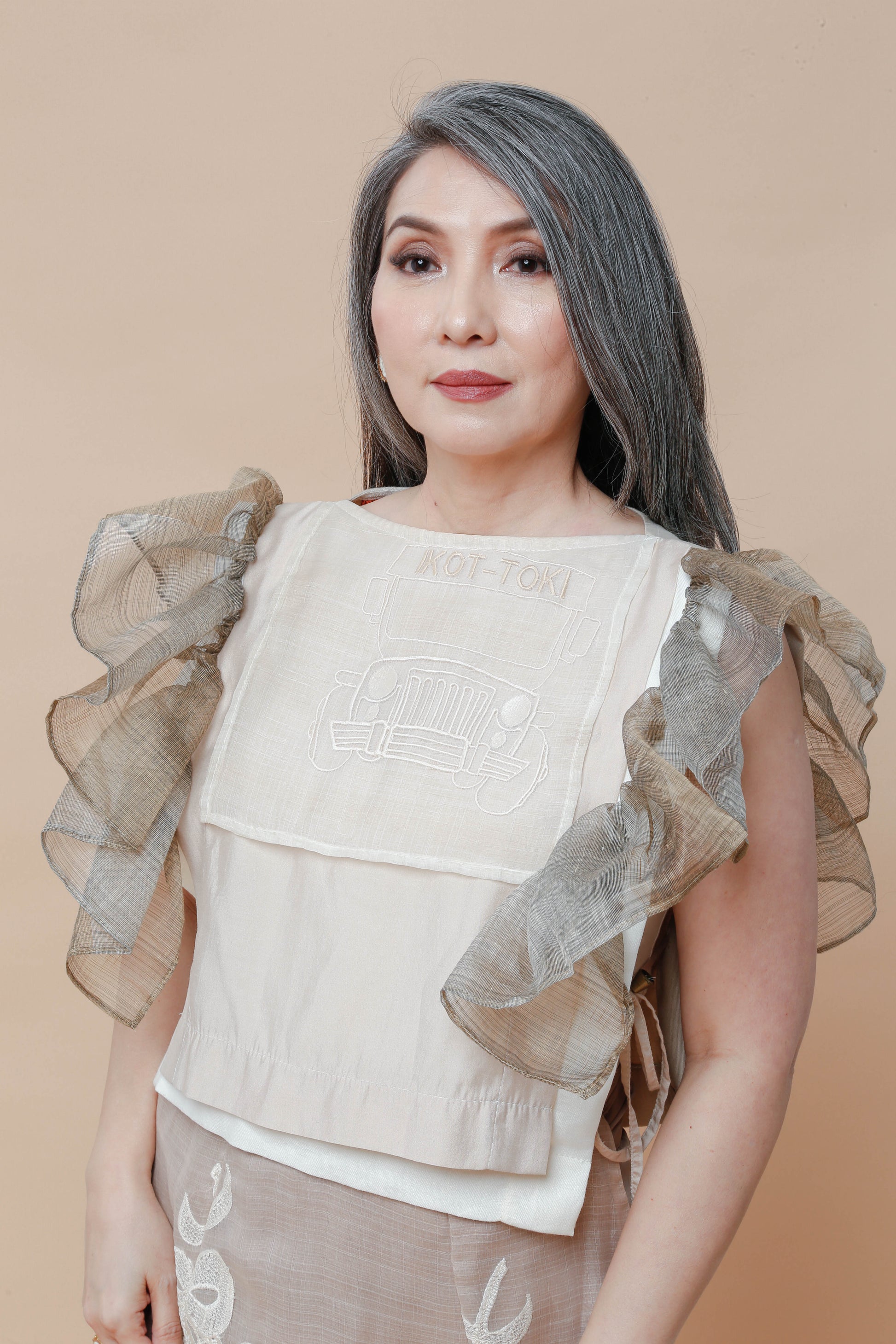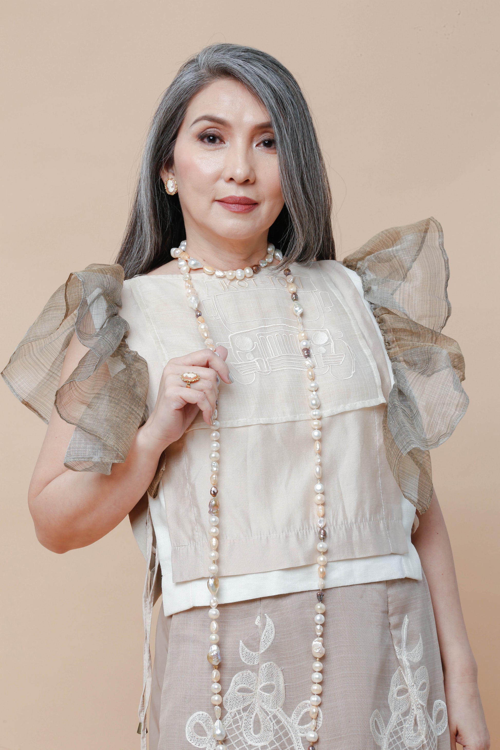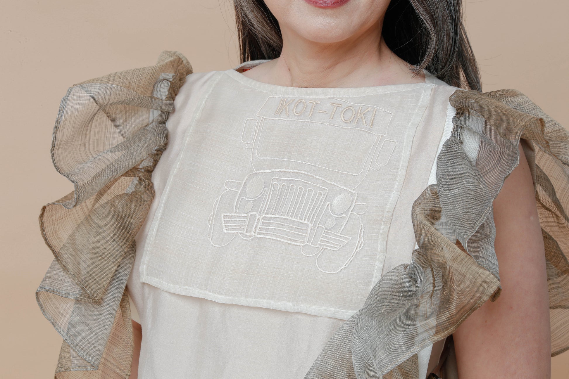 Hello UP friends! Celebrate Filipino heritage with the Ikot-Toki in Piña Bib, featuring the iconic jeepney signage familiar to UP people. Crafted with delicate piña calado embroidery, this piece elegantly merges cultural symbolism with artisanal craftsmanship, making it a refined accessory that honors tradition while elevating your style.