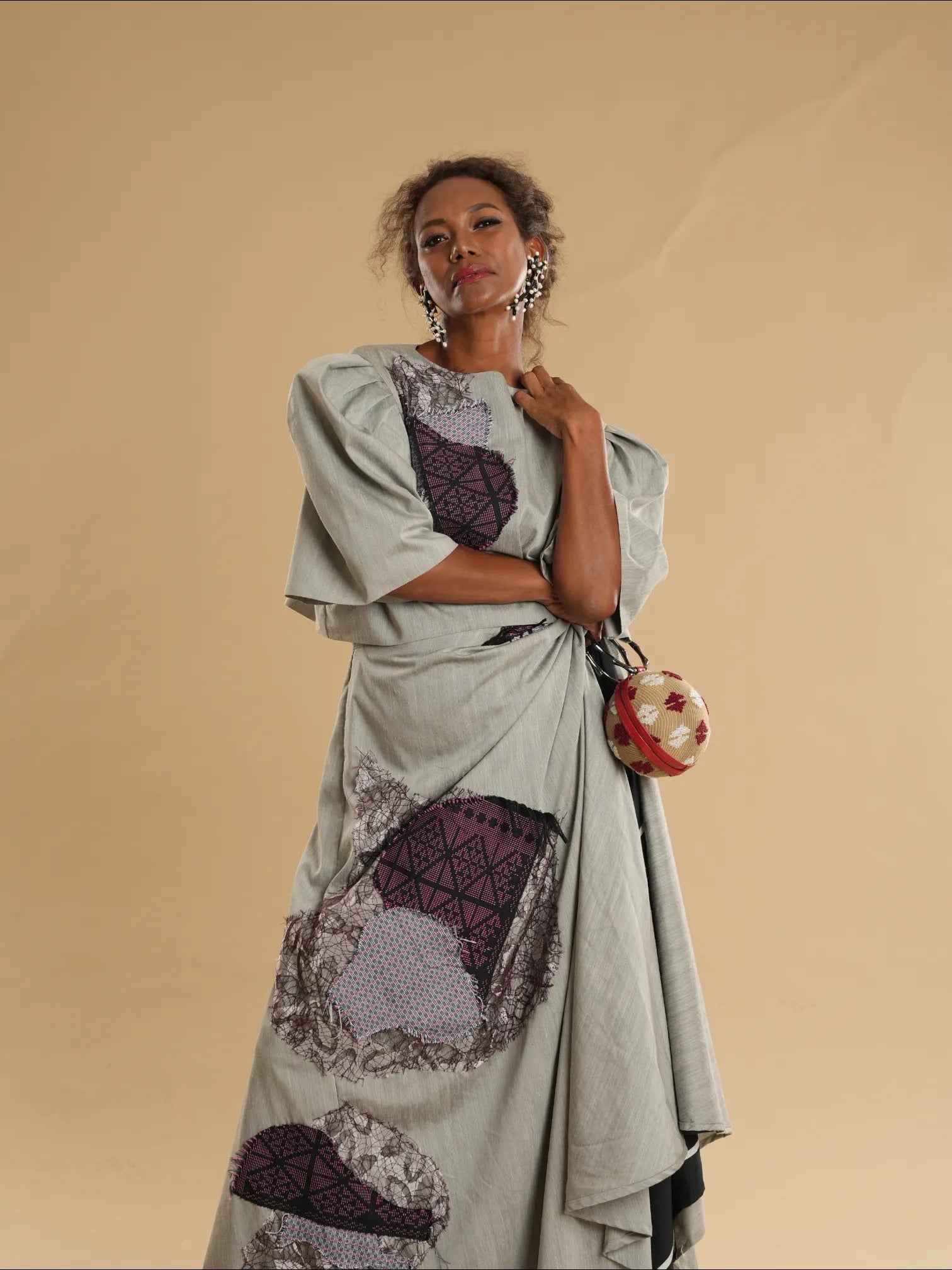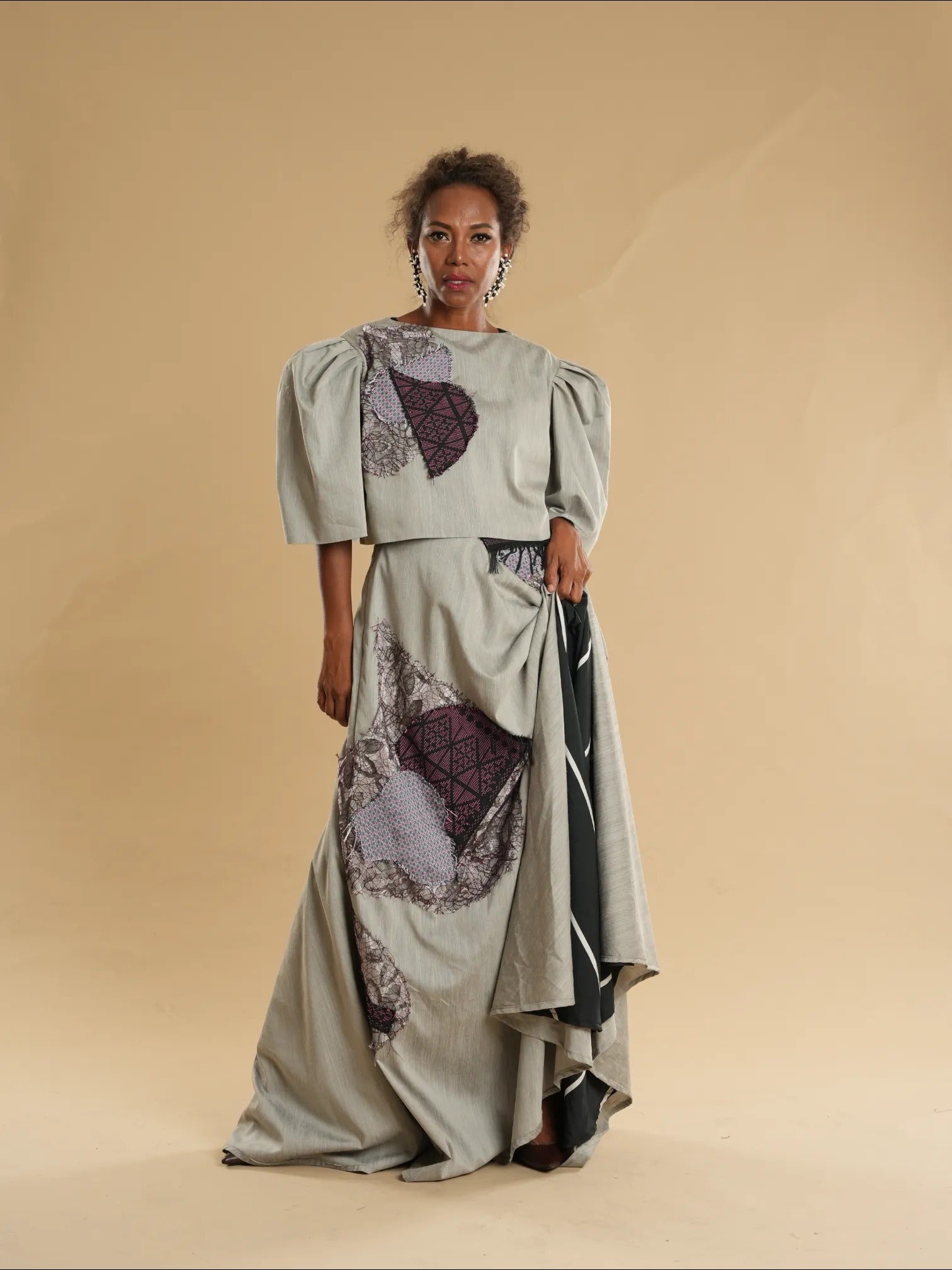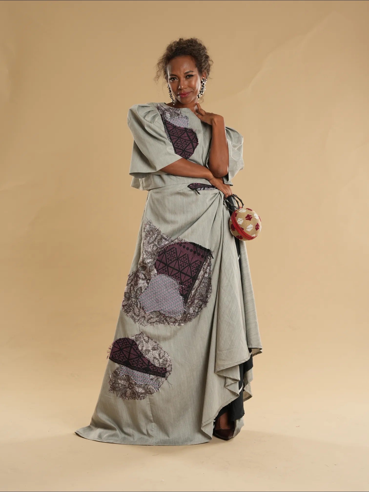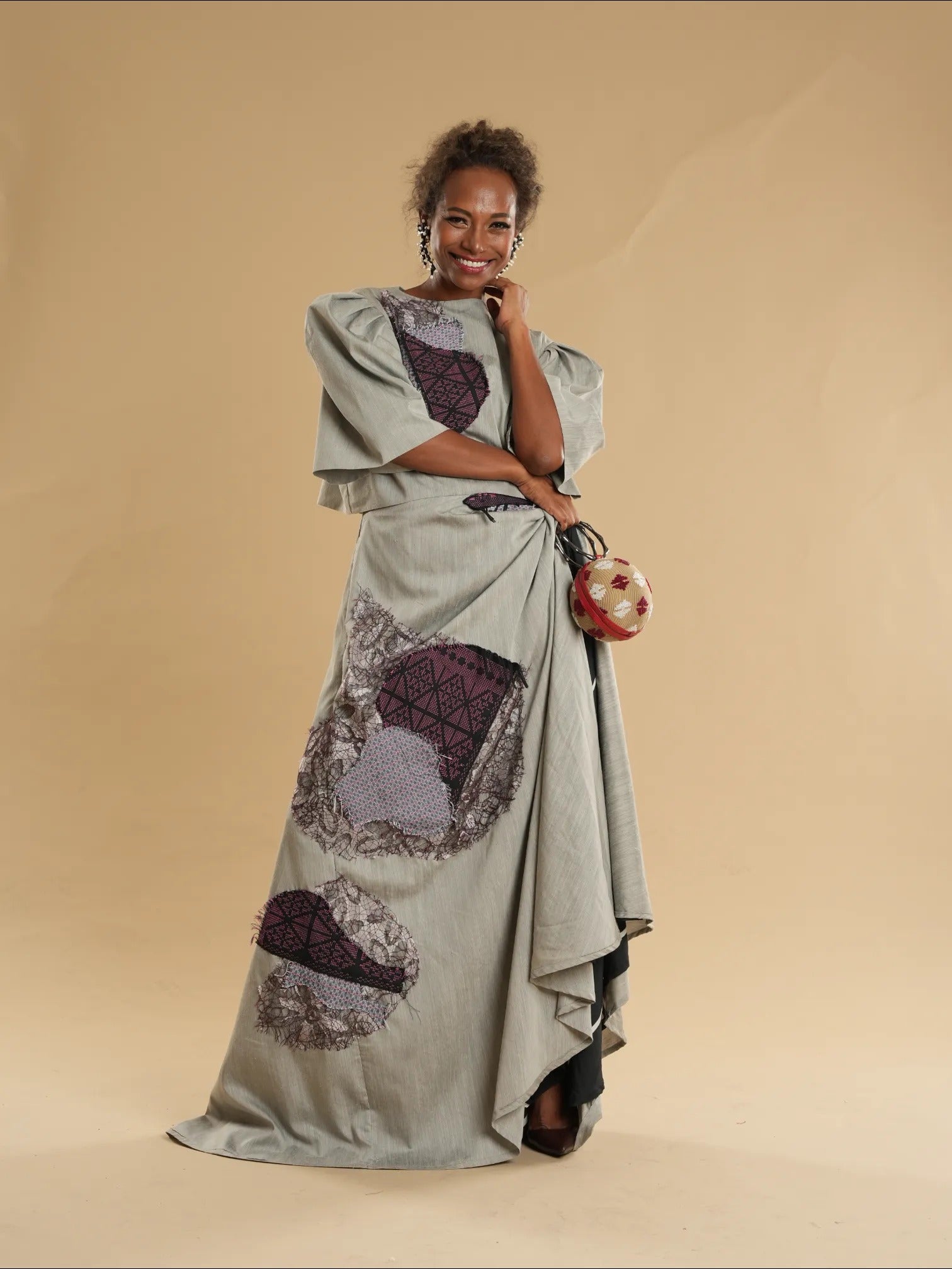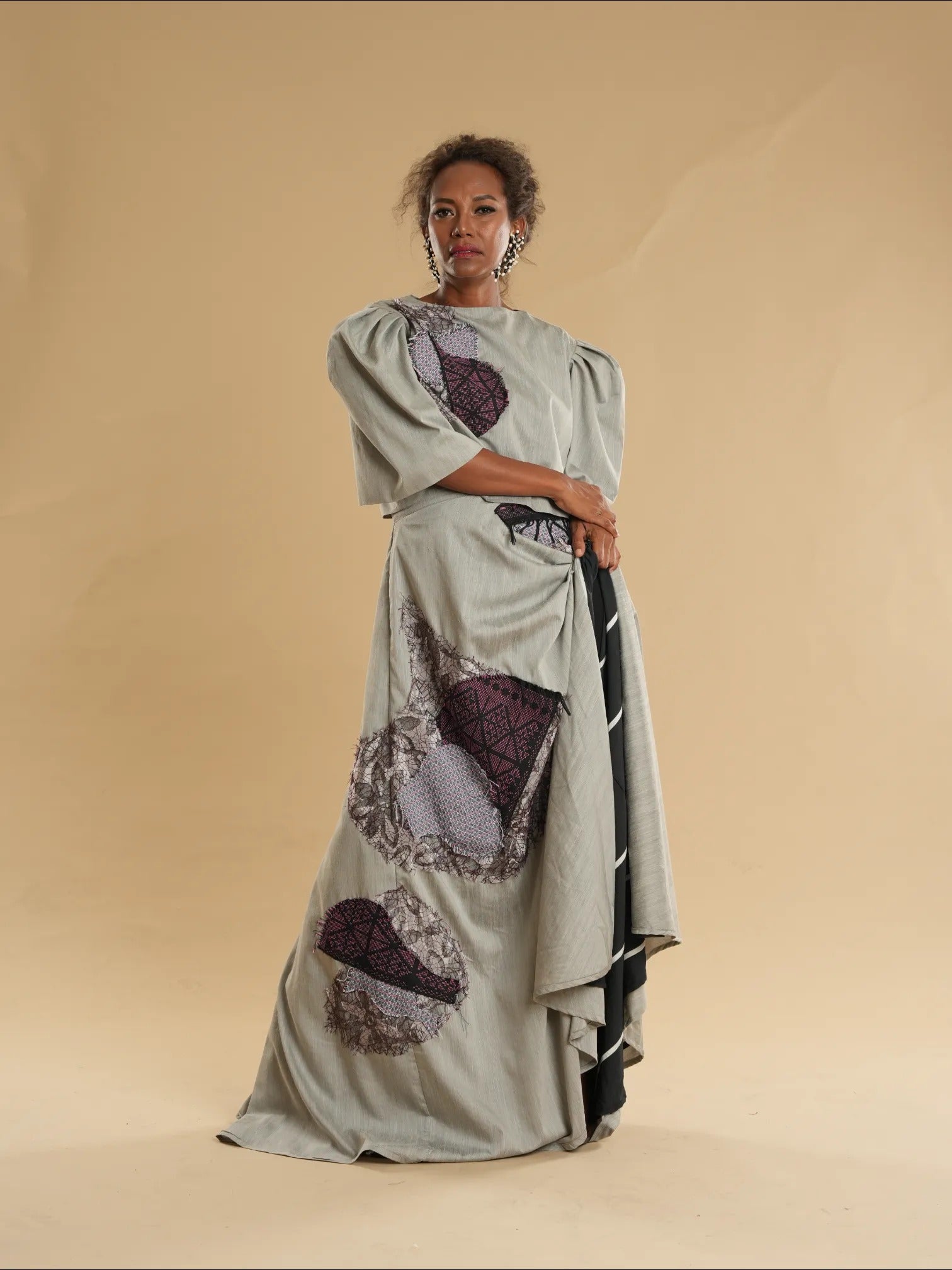 A grey modern Filipiniana highlighting the Yakan weave details. Embrace elegance with this contemporary style, perfect for making a statement in special occasion or cultural event.