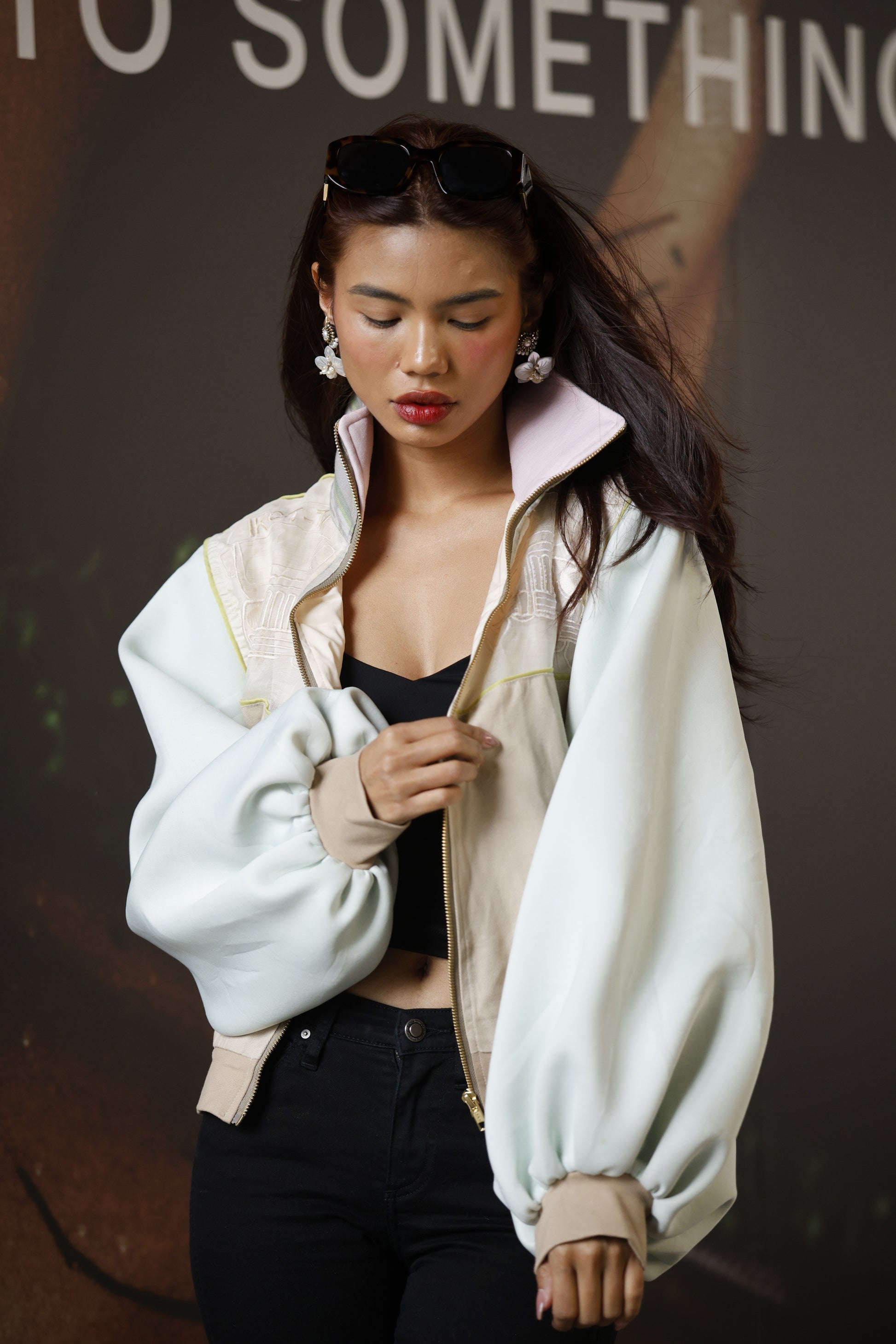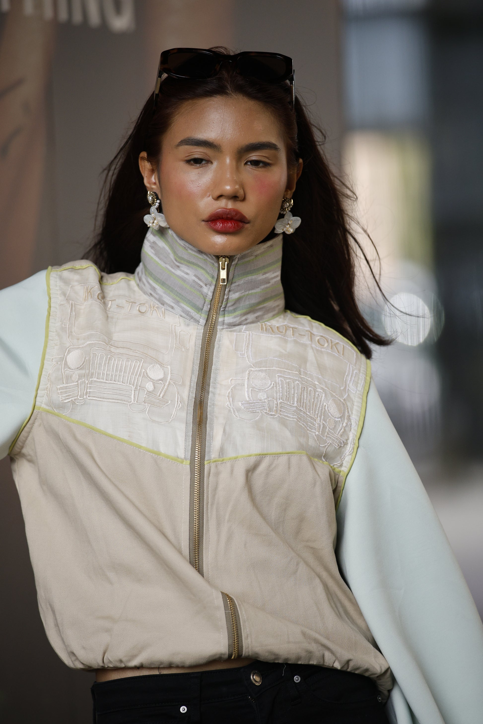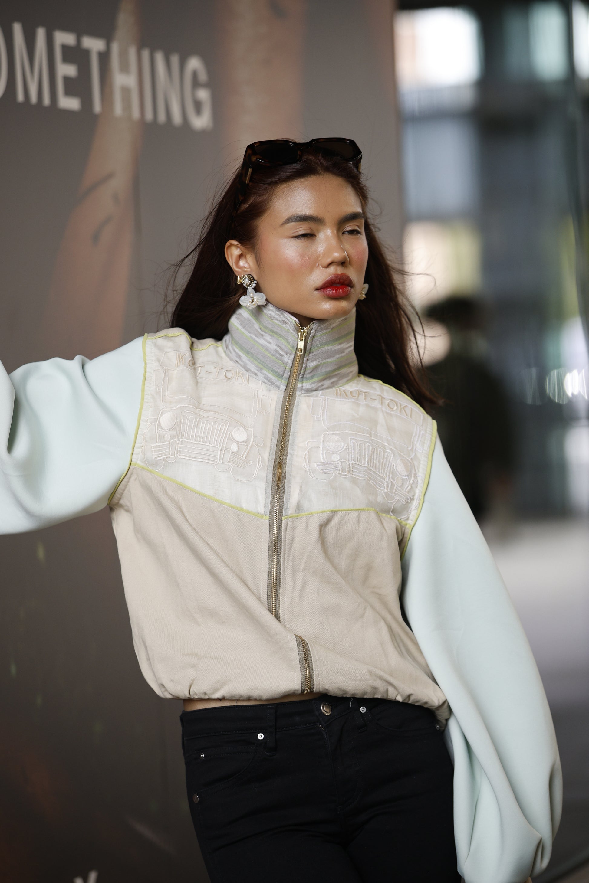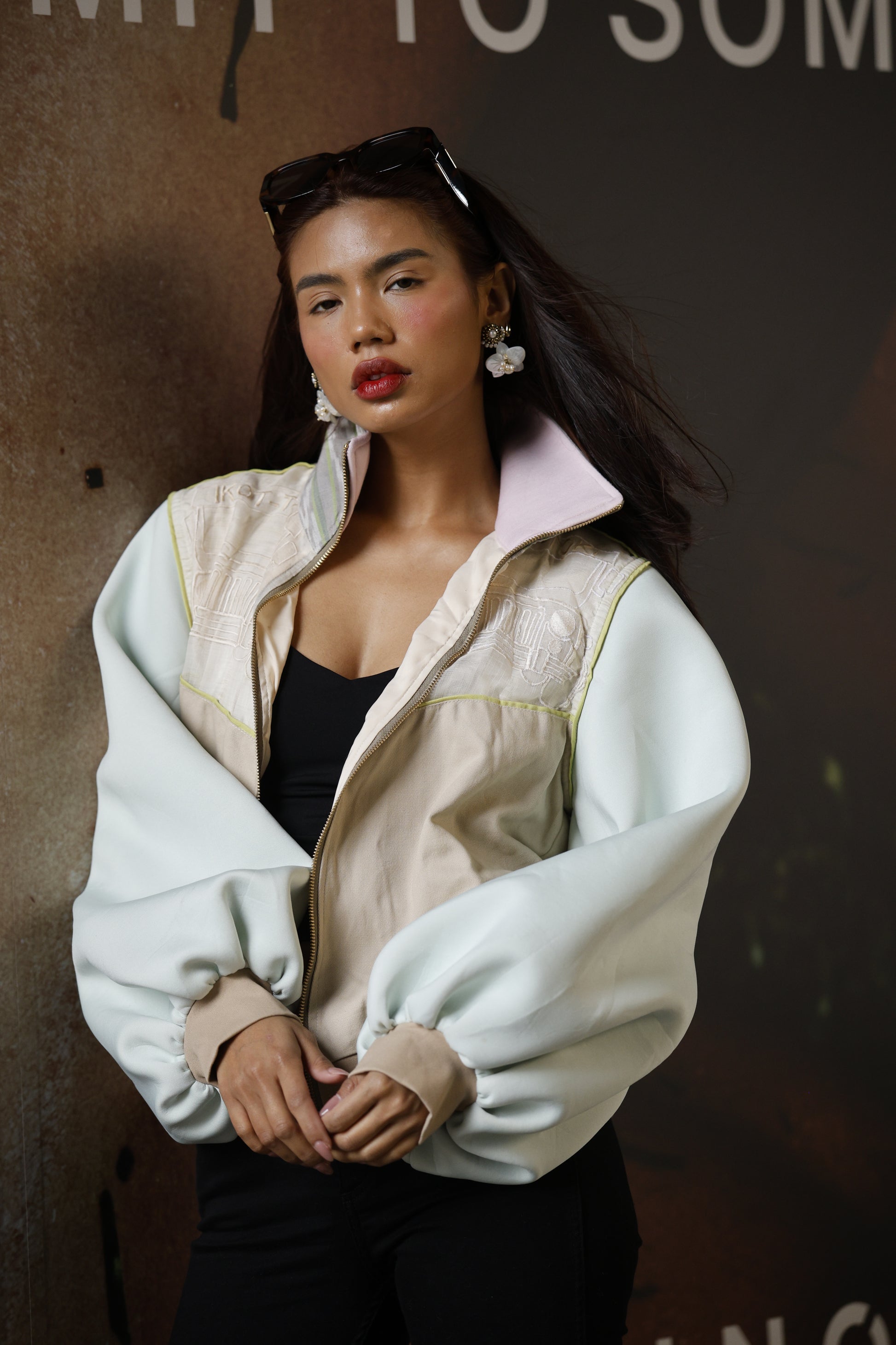 Ikot Toki Bomber Jacket in Mint Green Foamy Sleeves with Ikat
