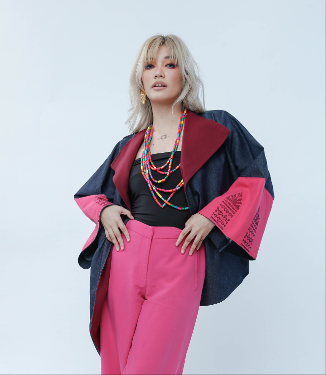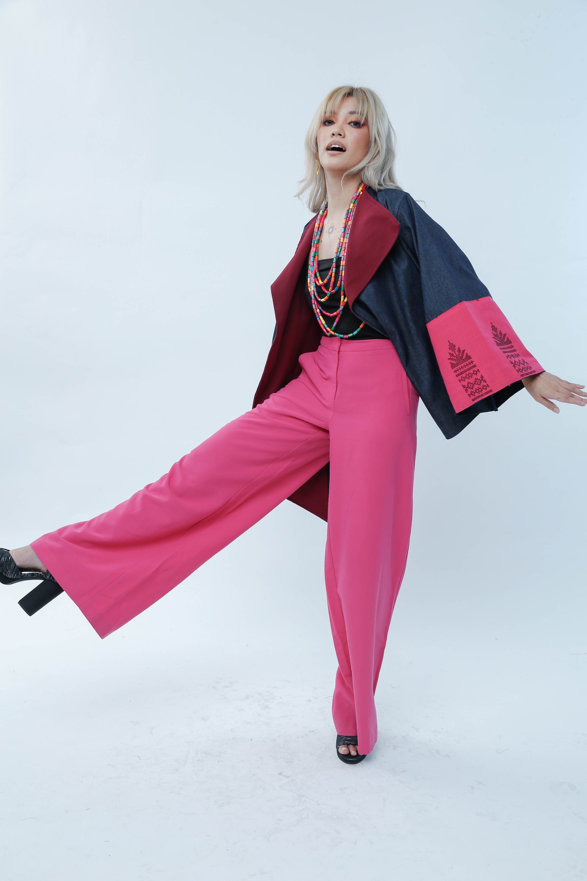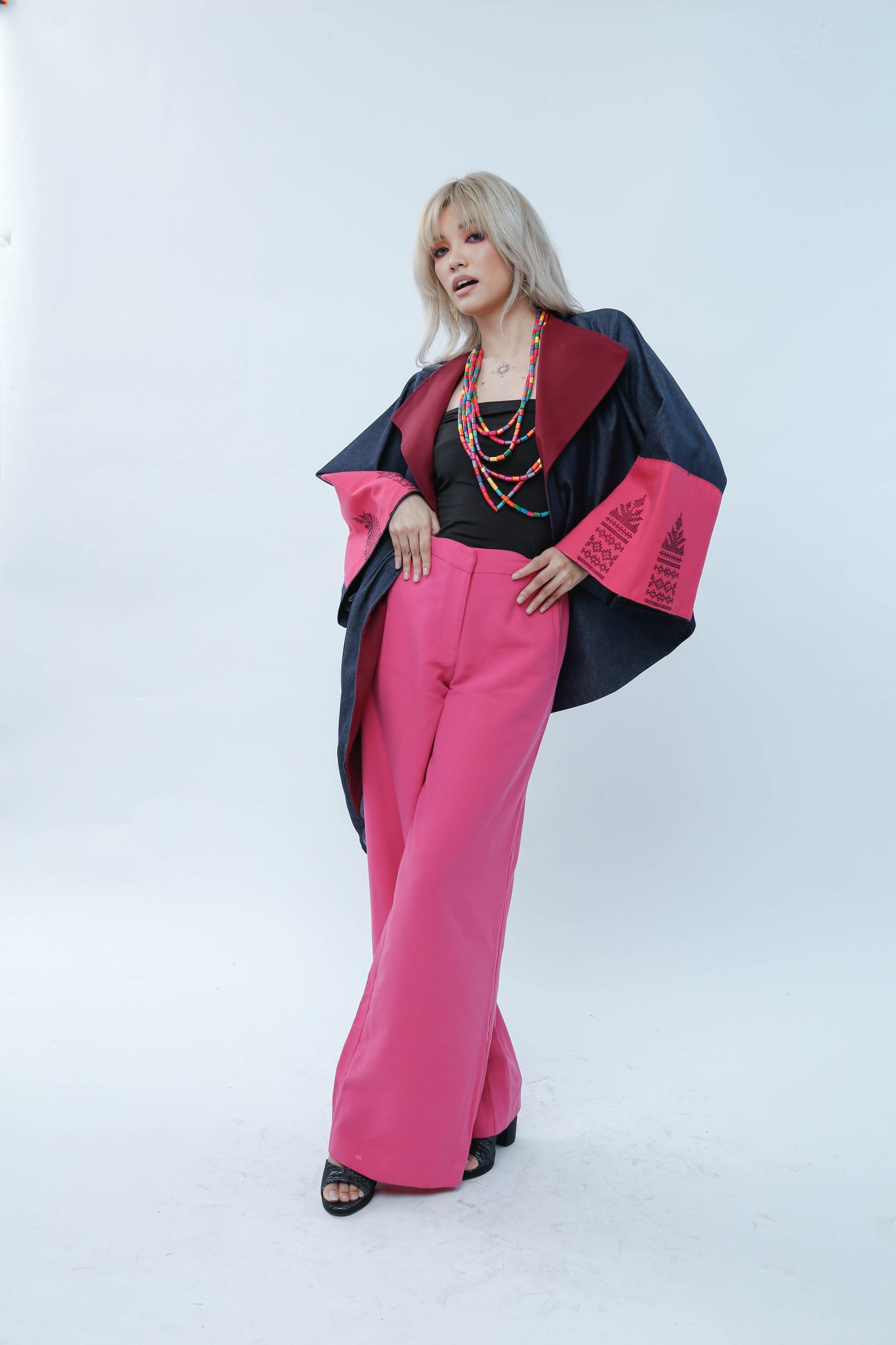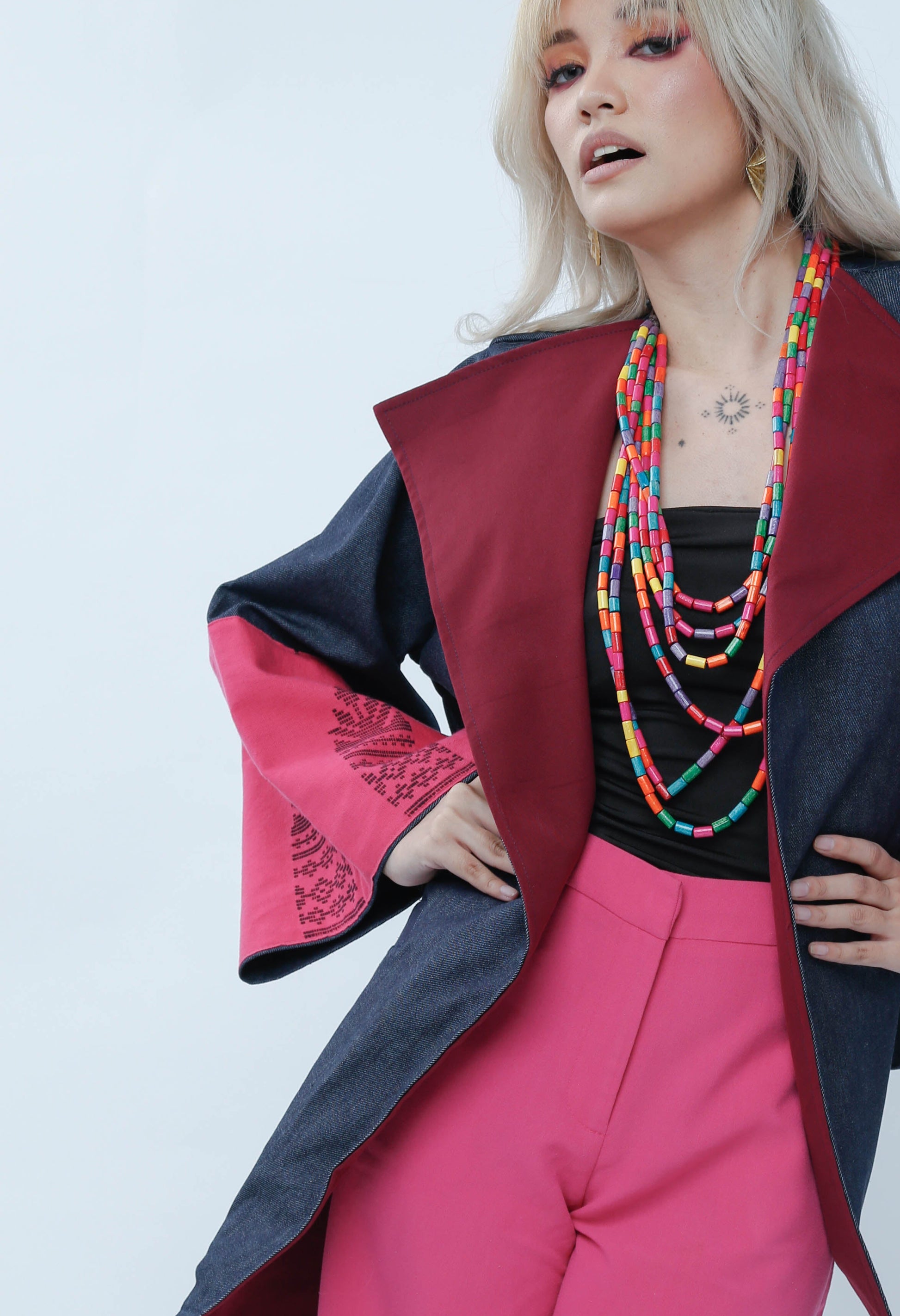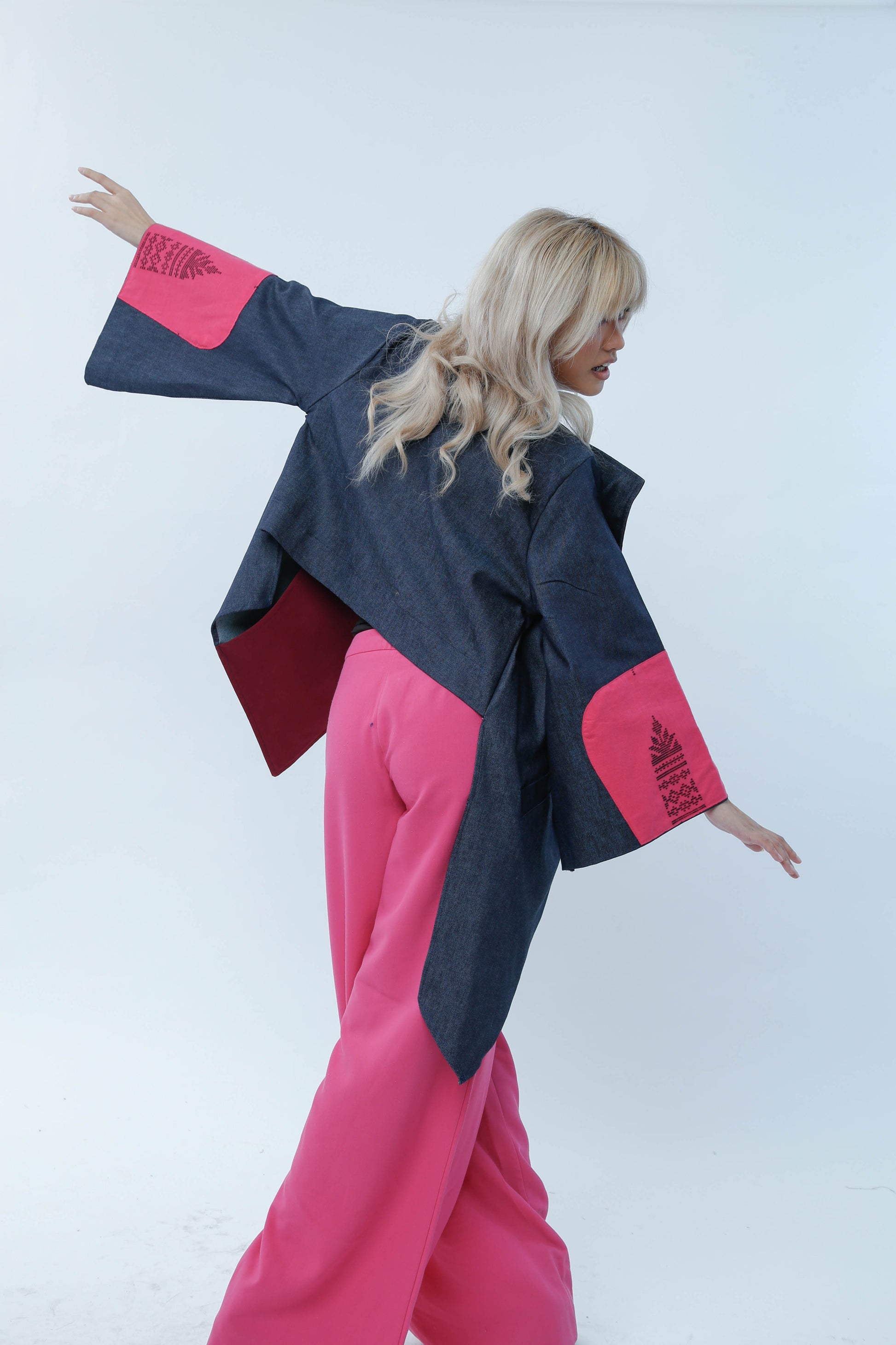 Add a splash of fun with the Kabogera Maroon Pink jacket, featuring a playful pink Inaul design. Its unique cut - long in the front and short at the back - offers a fresh twist on the classic blazer, perfect for making a bold, stylish statement wherever you go.
