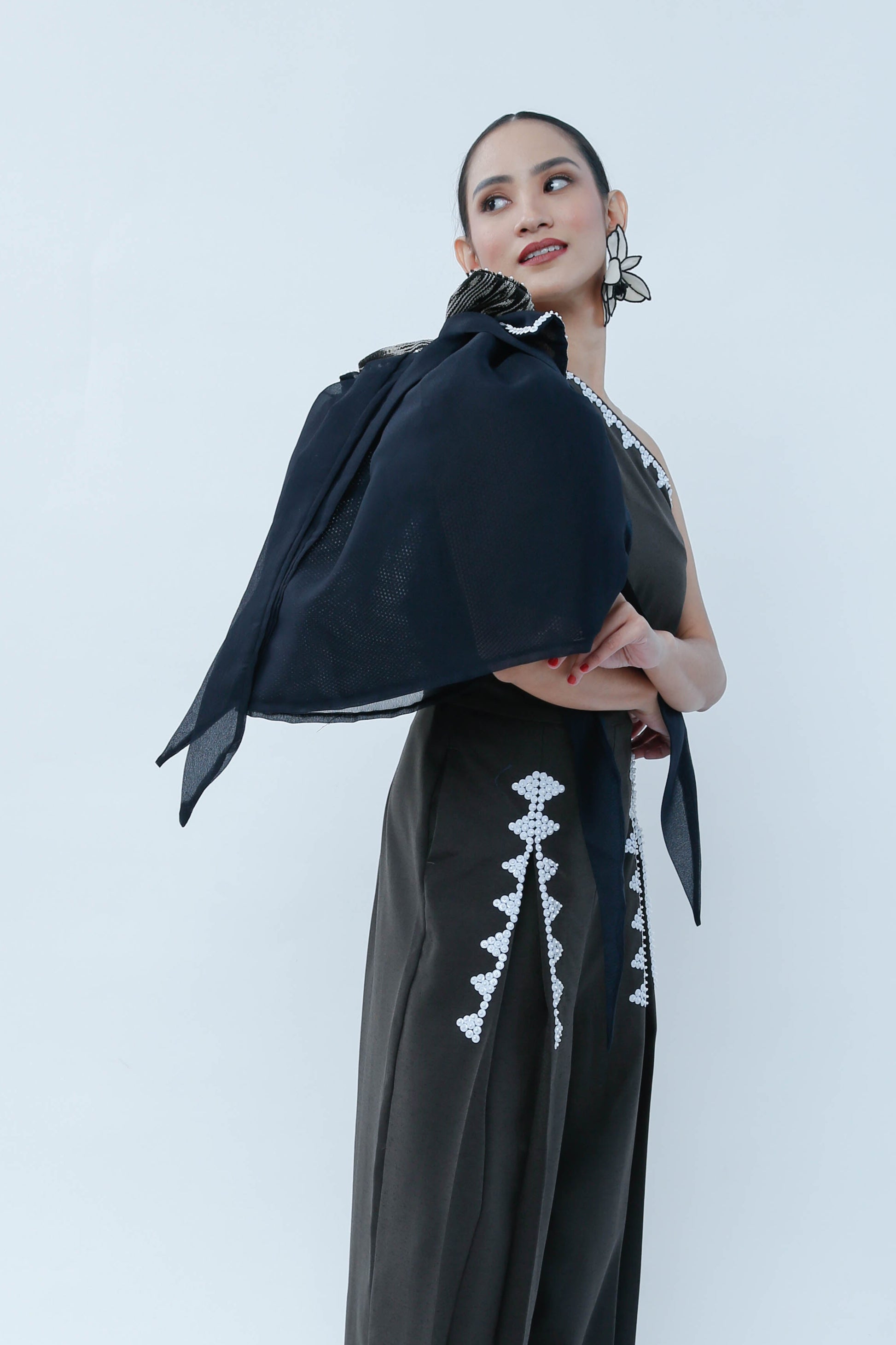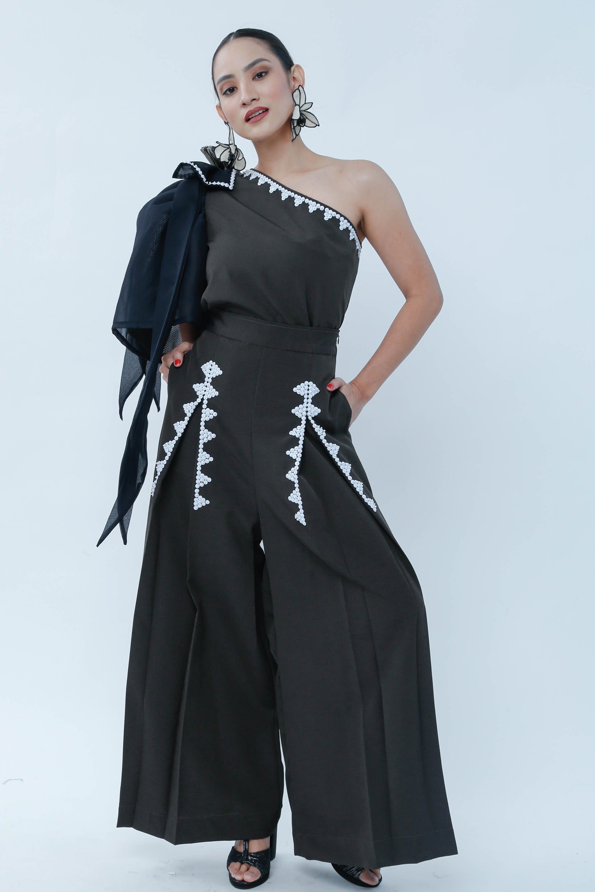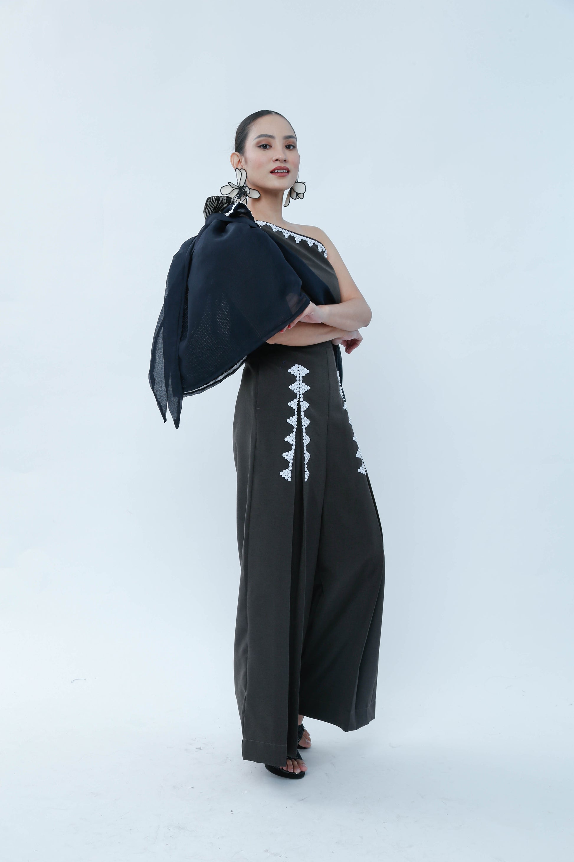 The Modern Filipina in Black showcases a sophisticated asymmetric design with a prominent big bow on one shoulder and a sleeveless opposite side, balancing elegance and modernity. Detailed bead work embellishes the front of both legs, enhancing the garment’s refined craftsmanship. A T'nalak bow accent complements the shoulder bow, adding subtle texture and dimension. This piece expertly fuses traditional Filipino elements with contemporary fashion, ideal for occasions demanding both style and cultural appreciation.