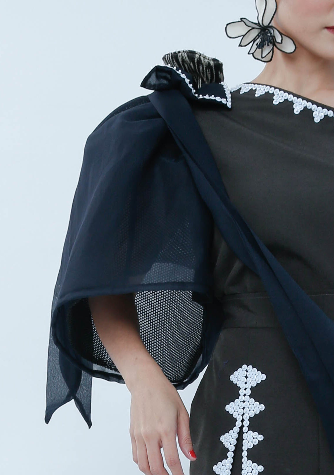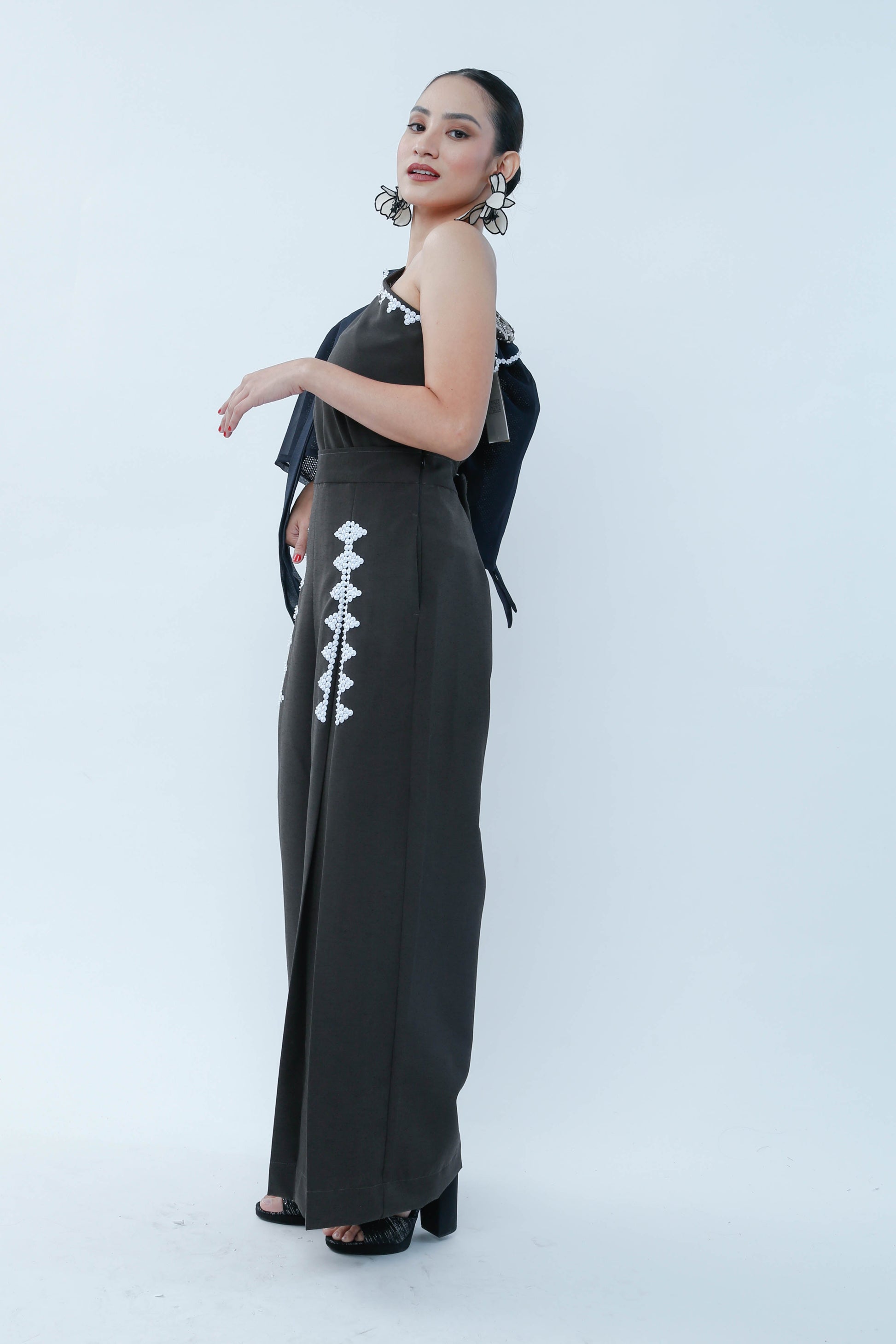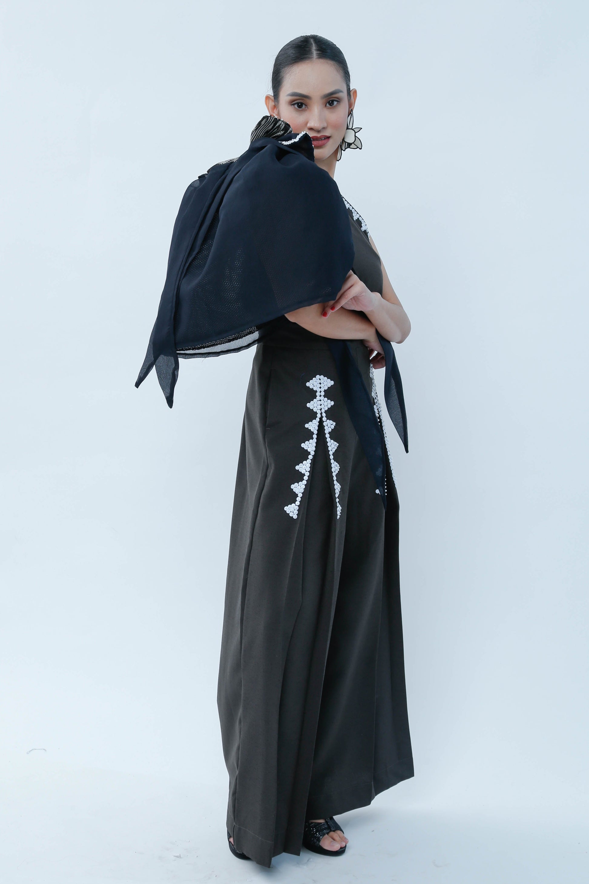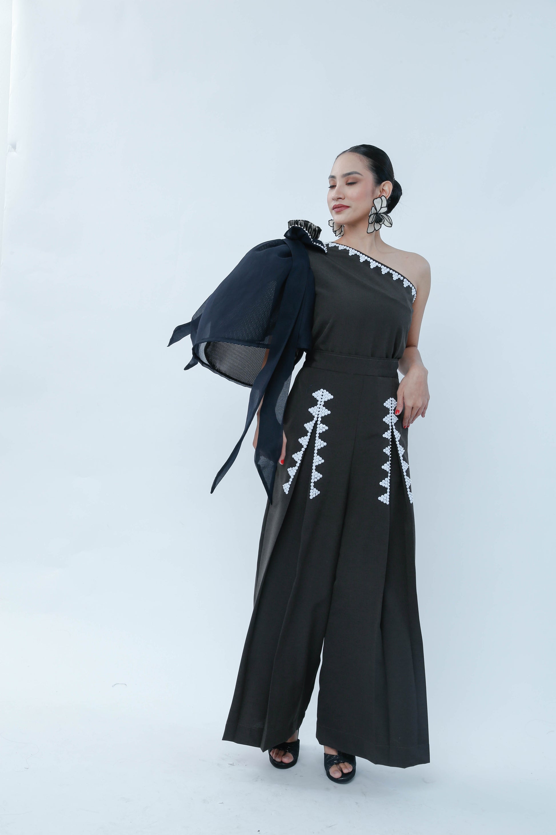 The Modern Filipina in Black showcases a sophisticated asymmetric design with a prominent big bow on one shoulder and a sleeveless opposite side, balancing elegance and modernity. Detailed bead work embellishes the front of both legs, enhancing the garment’s refined craftsmanship. A T'nalak bow accent complements the shoulder bow, adding subtle texture and dimension. This piece expertly fuses traditional Filipino elements with contemporary fashion, ideal for occasions demanding both style and cultural appreciation.
