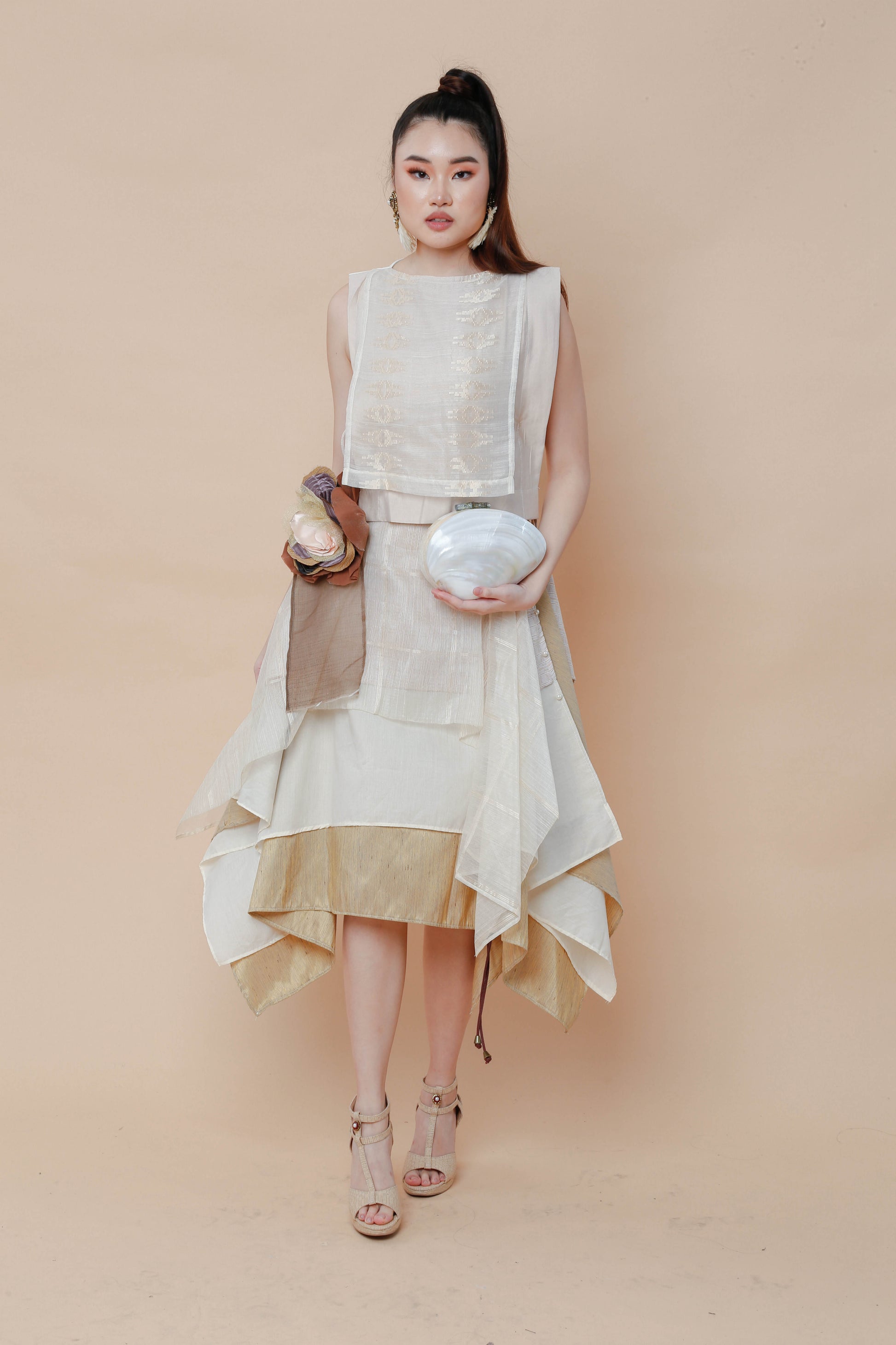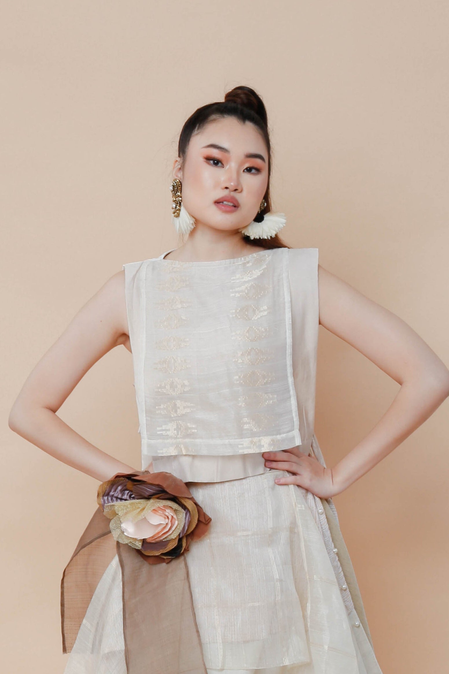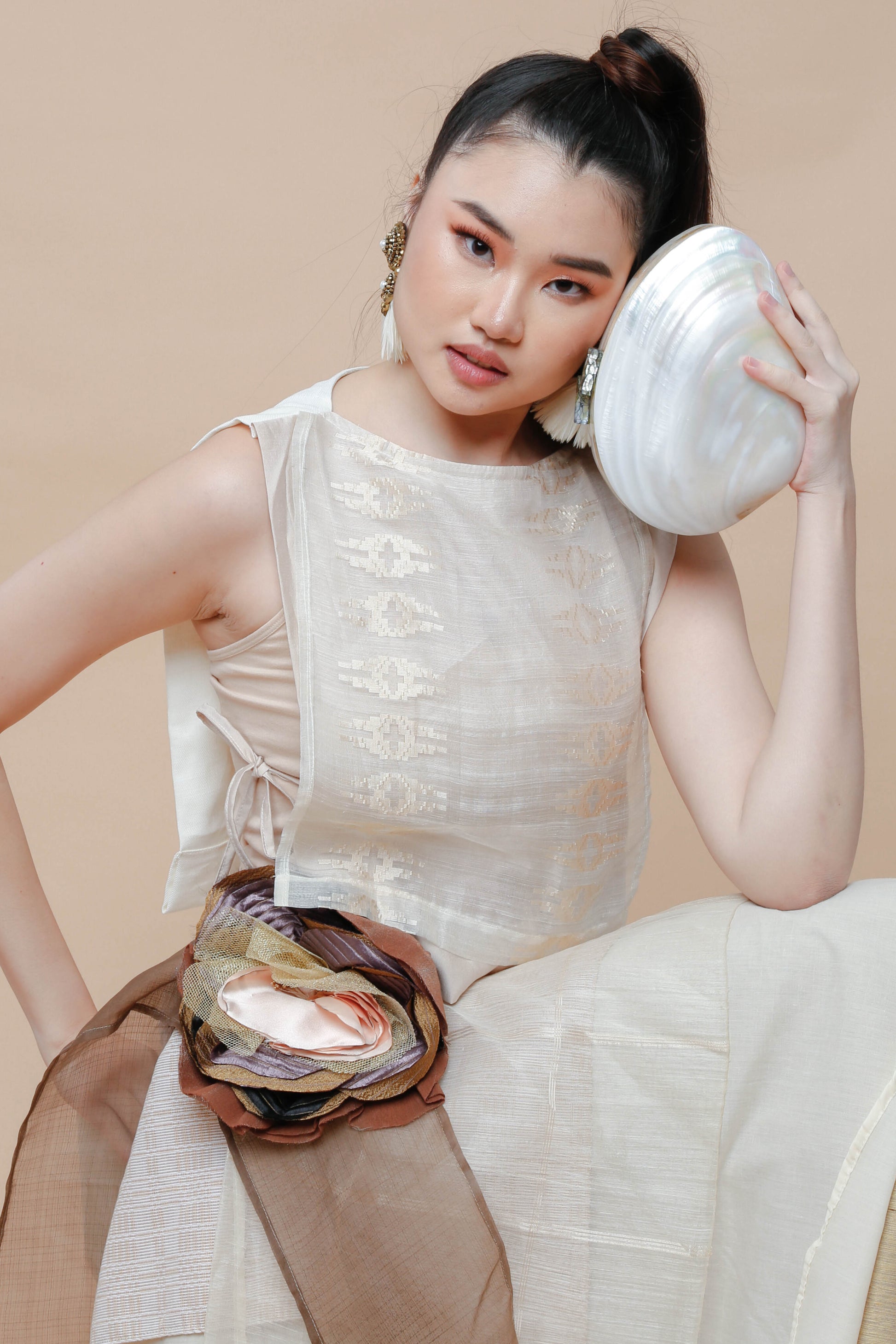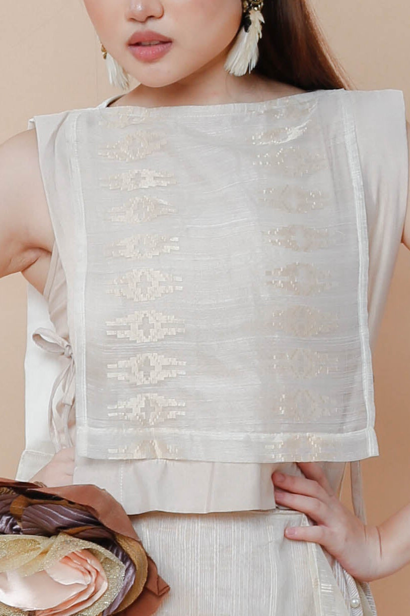 The Encantada Bib in Suksuk Piña Barong of Aklan showcases exquisite craftsmanship with its delicate suksuk weaving and elegant gold accents. Made from premium Piña fabric sourced in Aklan, this bib combines traditional Filipino textile artistry with refined design, offering a distinguished accessory that enhances any ensemble while honoring cultural heritage.