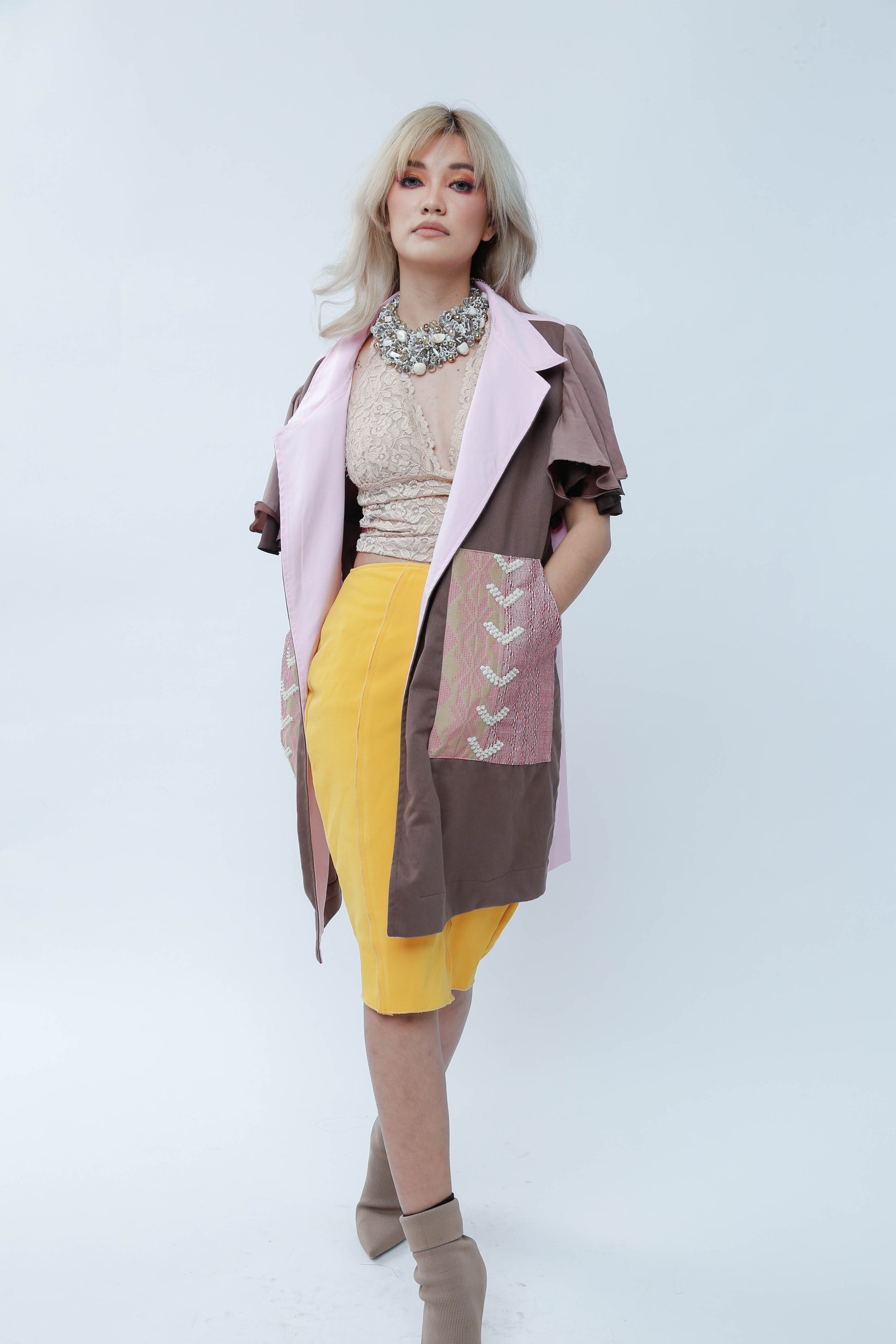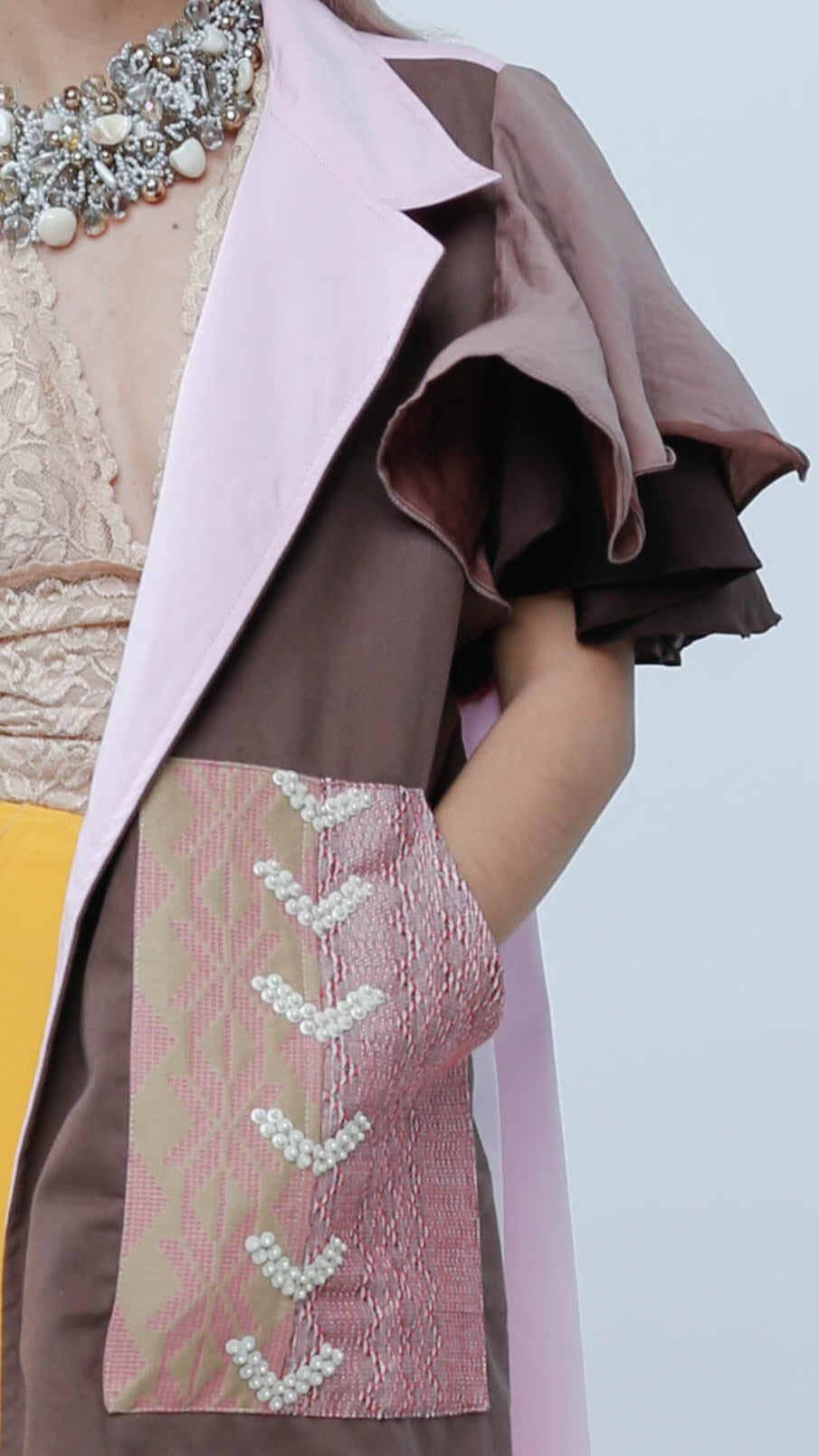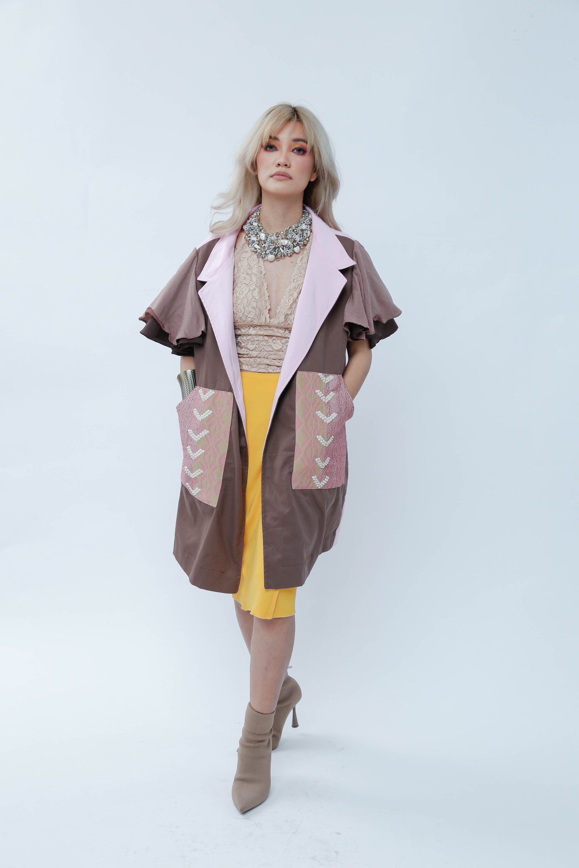 Step out in style with "Panganay in Brown," a playful trench coat blending warm brown and soft pink hues. This chic combo adds a fun twist to classic outerwear, perfect for brightening up any rainy day or cool evening. Cozy and eye-catching, it’s designed to keep you comfortable while turning heads wherever you go.