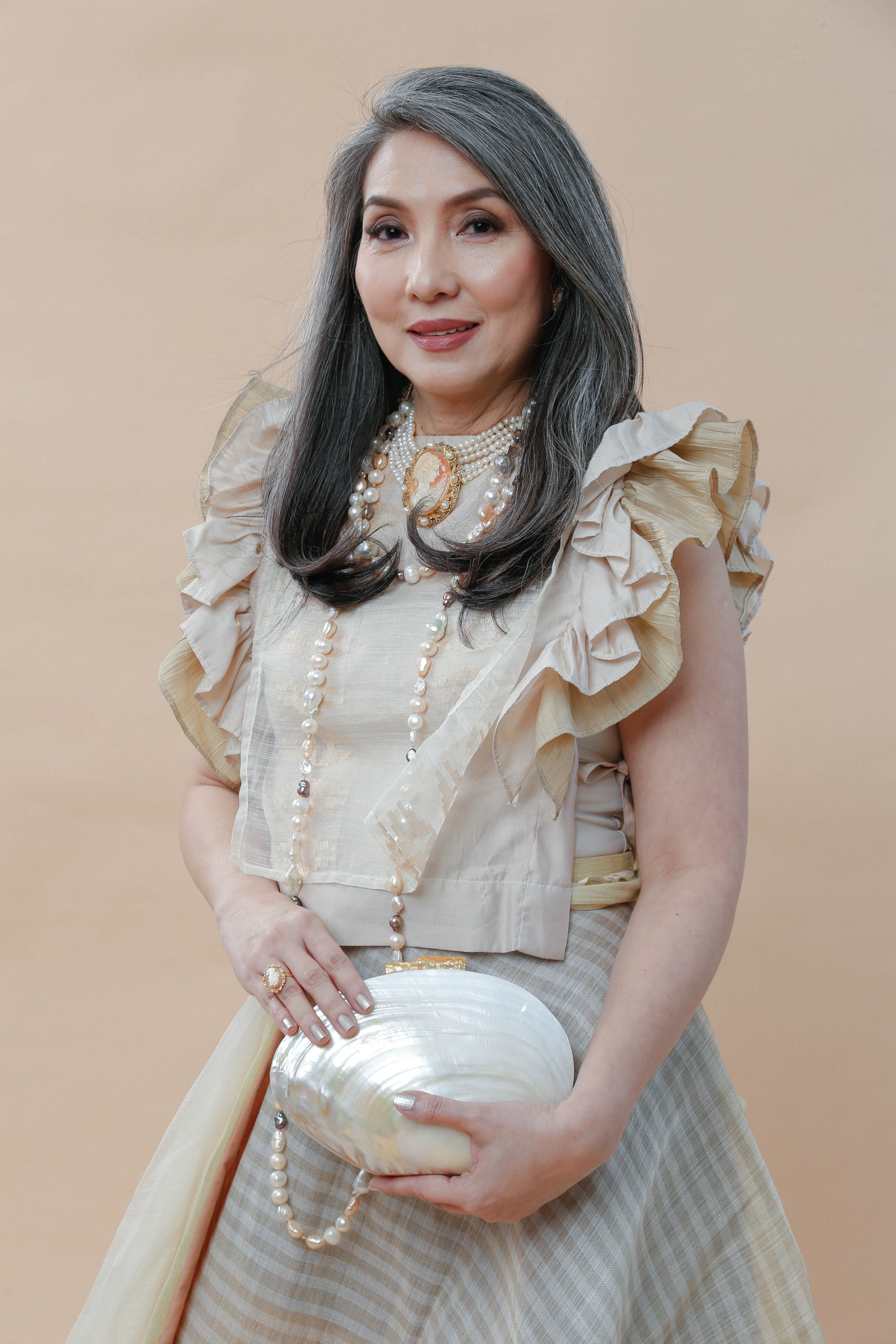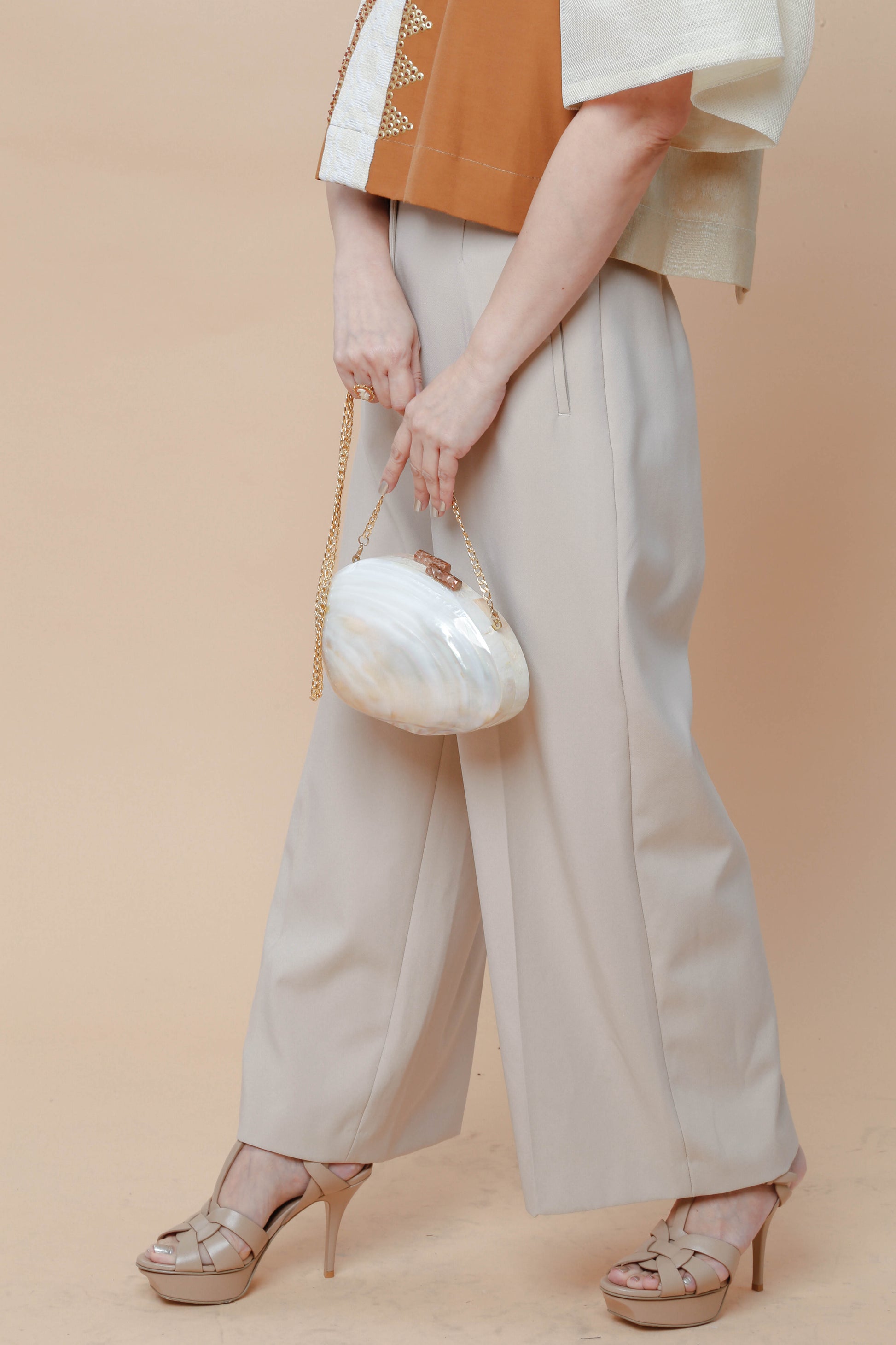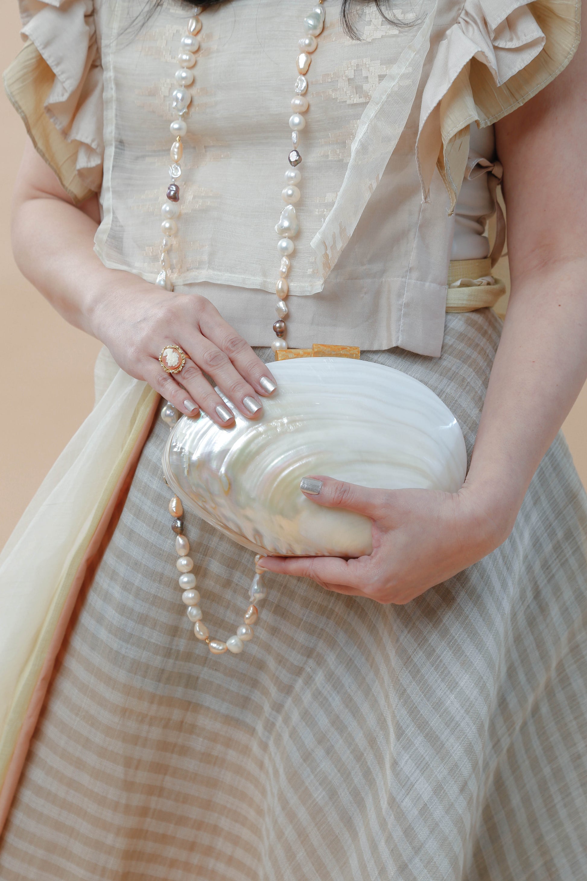 The Perlas ng Silanganan clutch bag embodies refined elegance with its exquisite shell construction. This sophisticated accessory offers a graceful sheen and a distinctive texture, making it an ideal choice for elevating your evening ensemble. Compact yet striking, it pairs timeless natural beauty with modern design to complement your most polished looks.